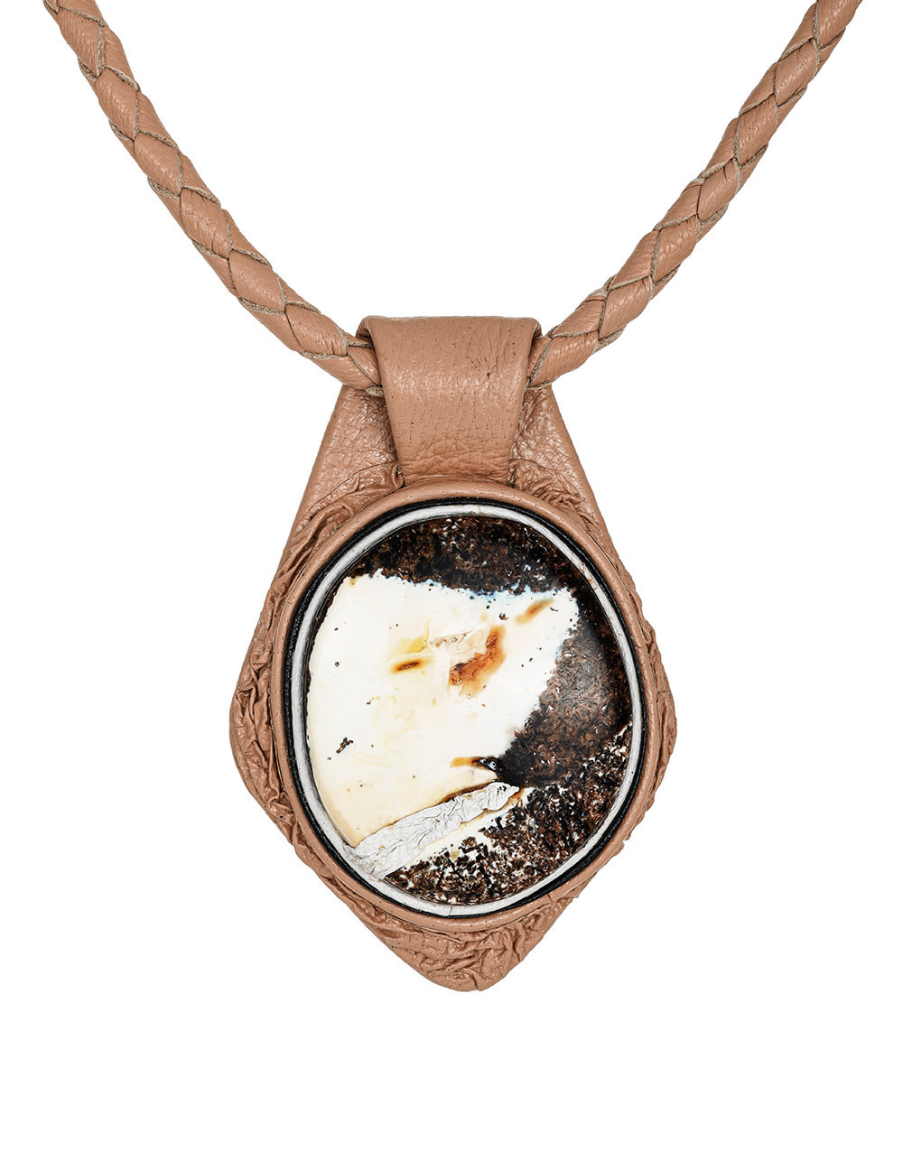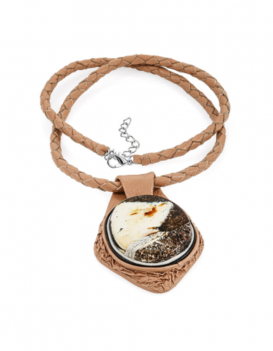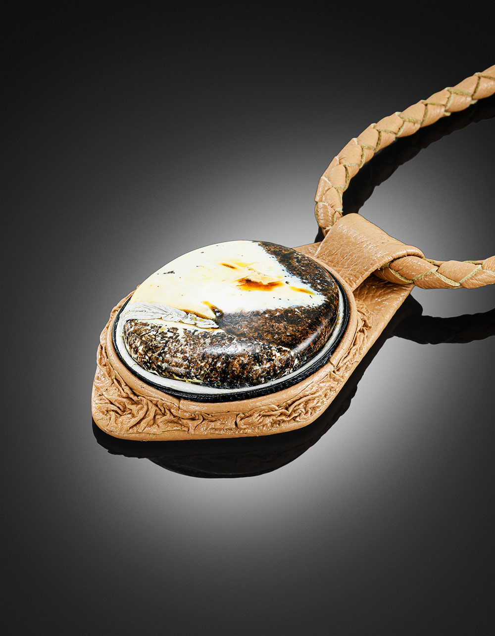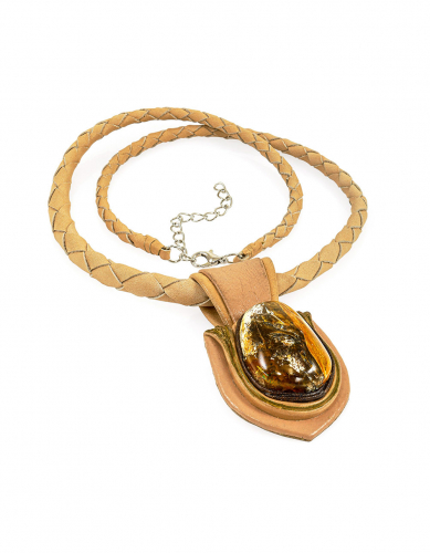 Стильное колье из кожи и натурального пейзажного янтаря «Амазонка»