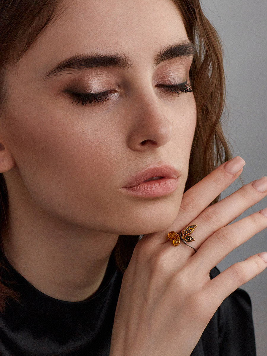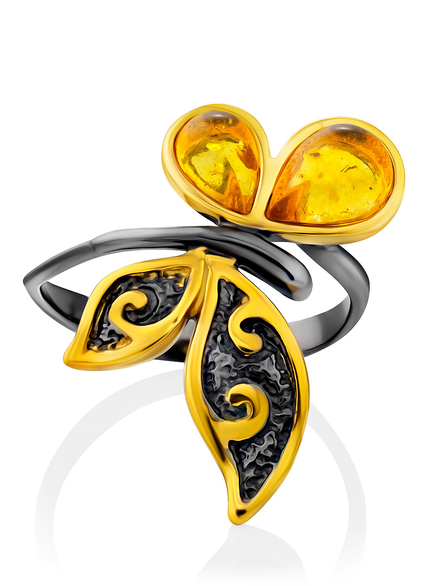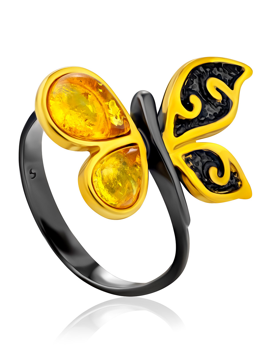 Стильное яркое кольцо-бабочка из янтаря «Апрель»