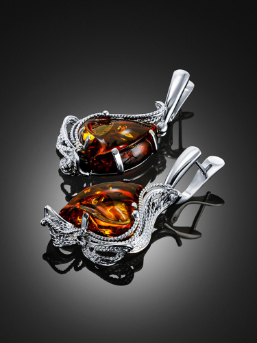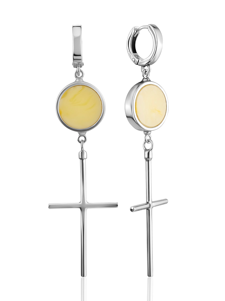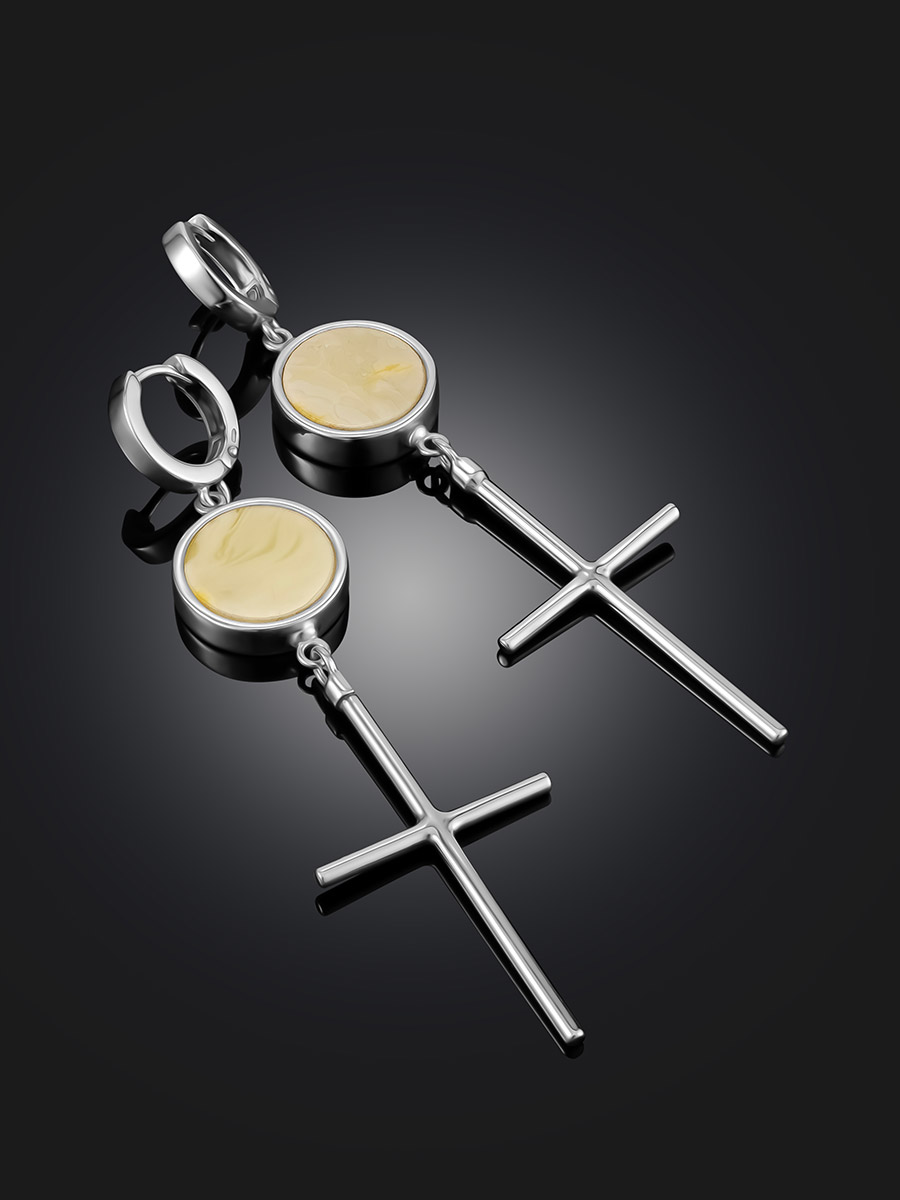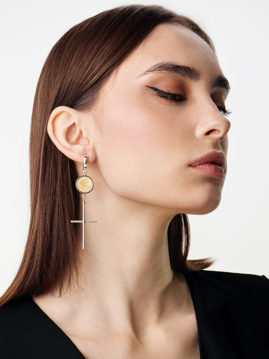 Стильные серьги c подвесками-крестами и медовым янтарём Palazzo