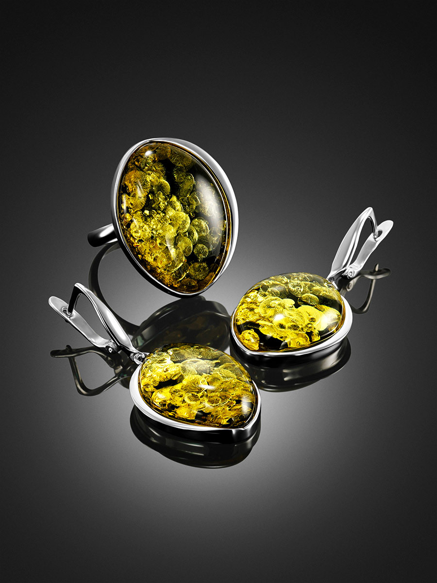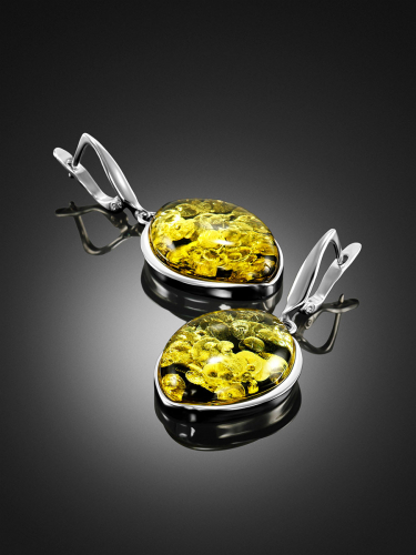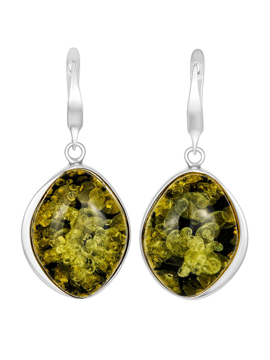 Стильные серьги с искрящимся темно-зелёным янтарём «Лагуна»