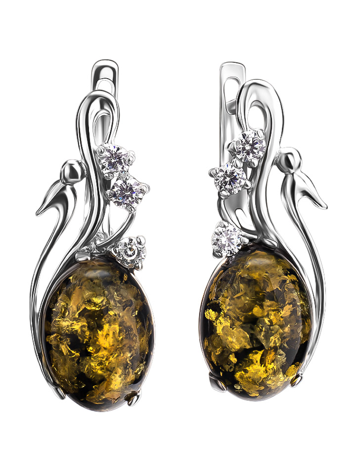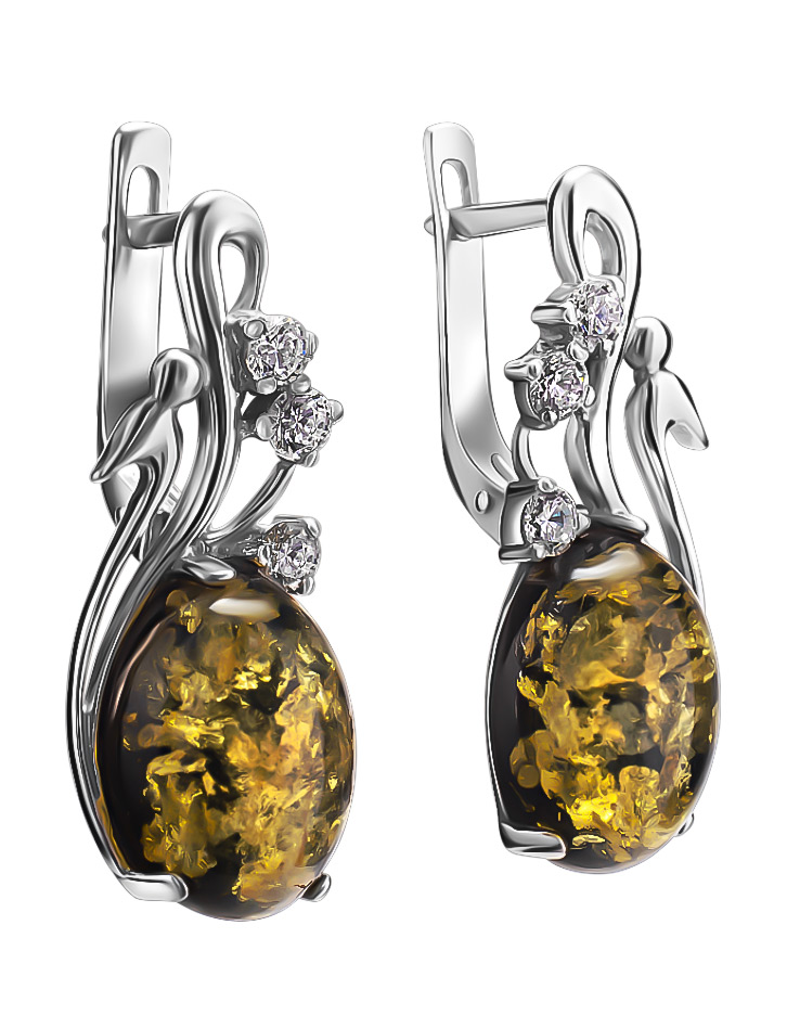 Стильные серьги с натуральным зеленым искрящимся янтарём и кристаллами «Мелисса»