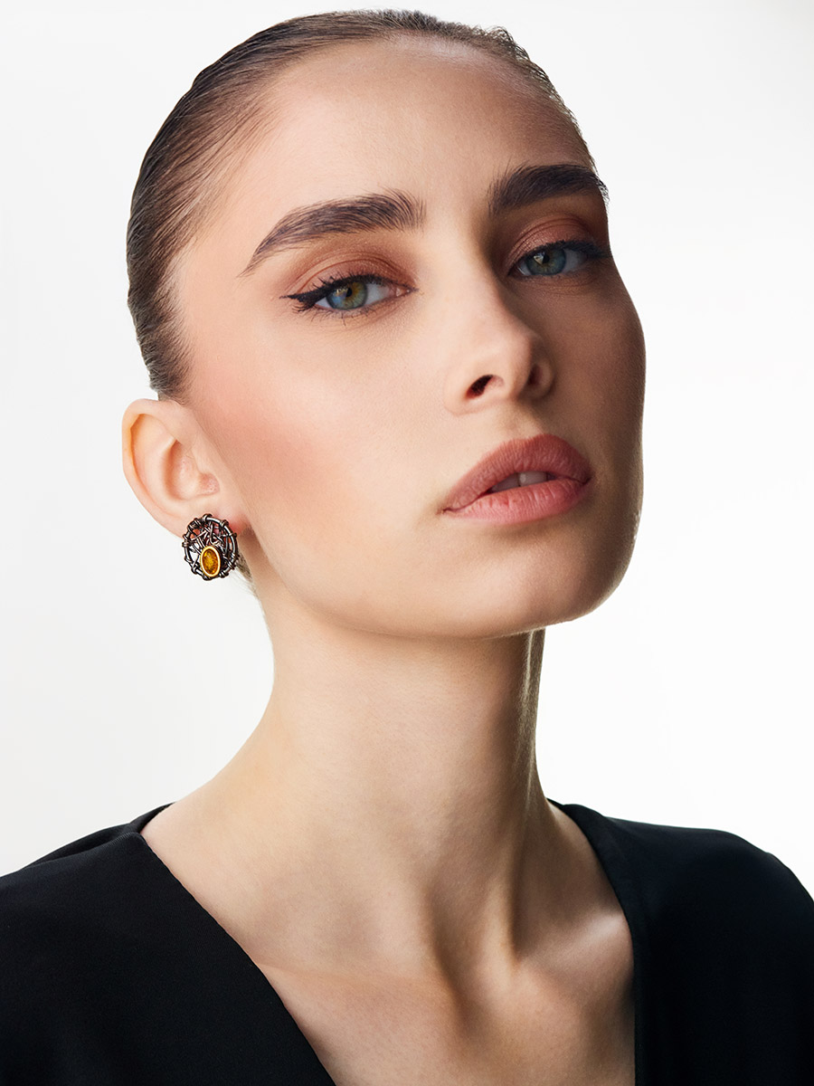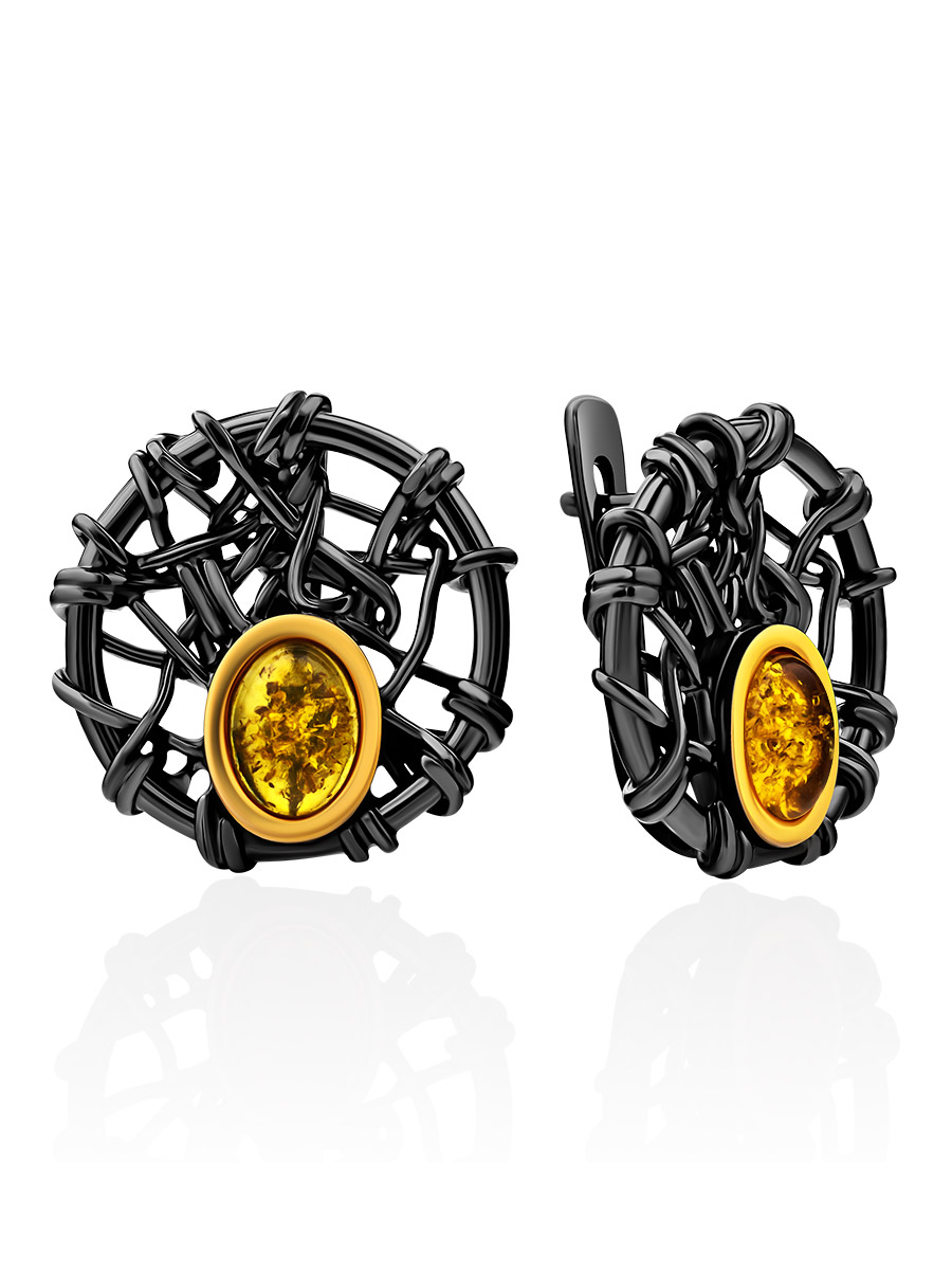 Стильные яркие серьги «Гнездо» с натуральным янтарём