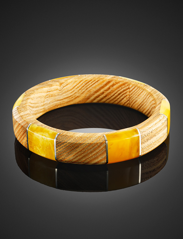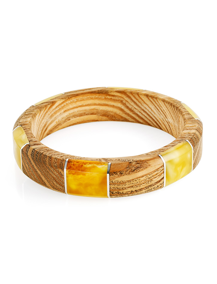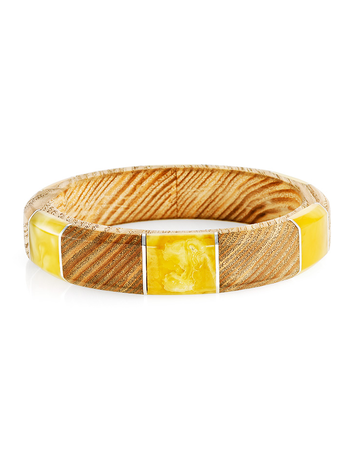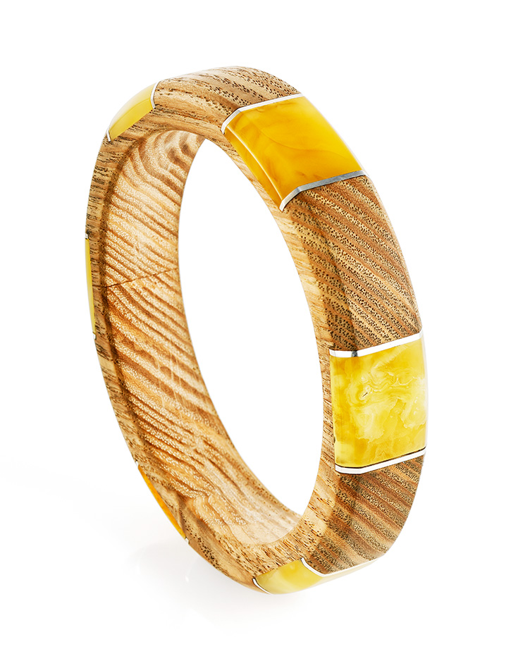 Стильный браслет-бэнгл из дерева, натурального балтийского янтаря «Индонезия»