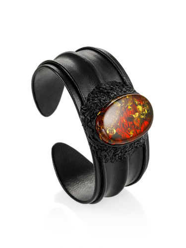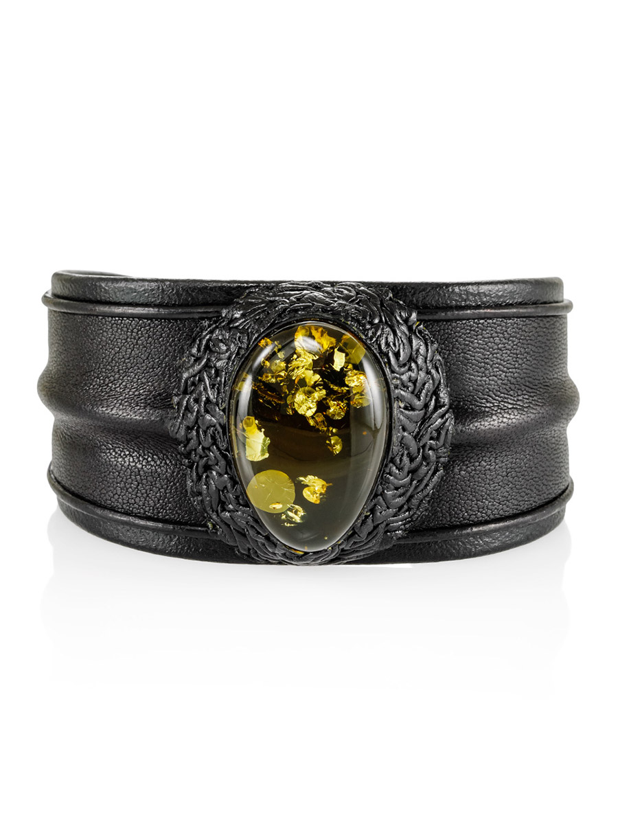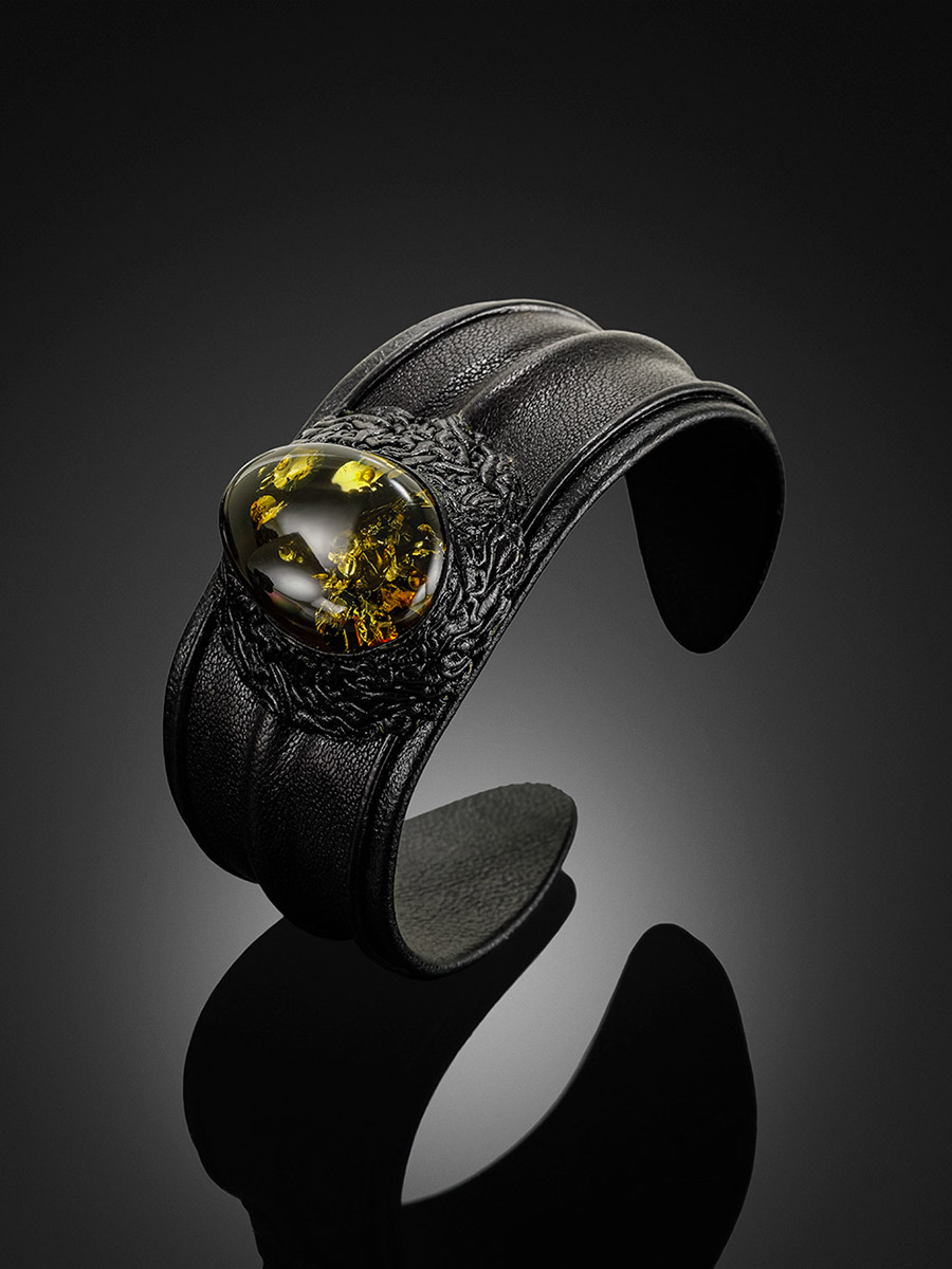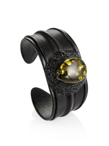 Стильный браслет из кожи и натурального балтийского янтаря с искрящейся текстурой «Нефертити»