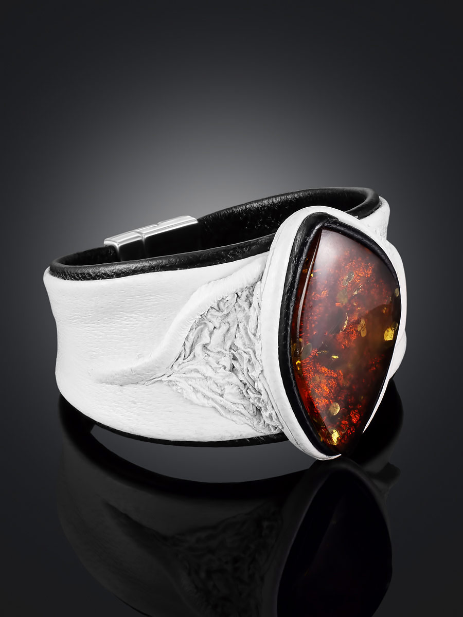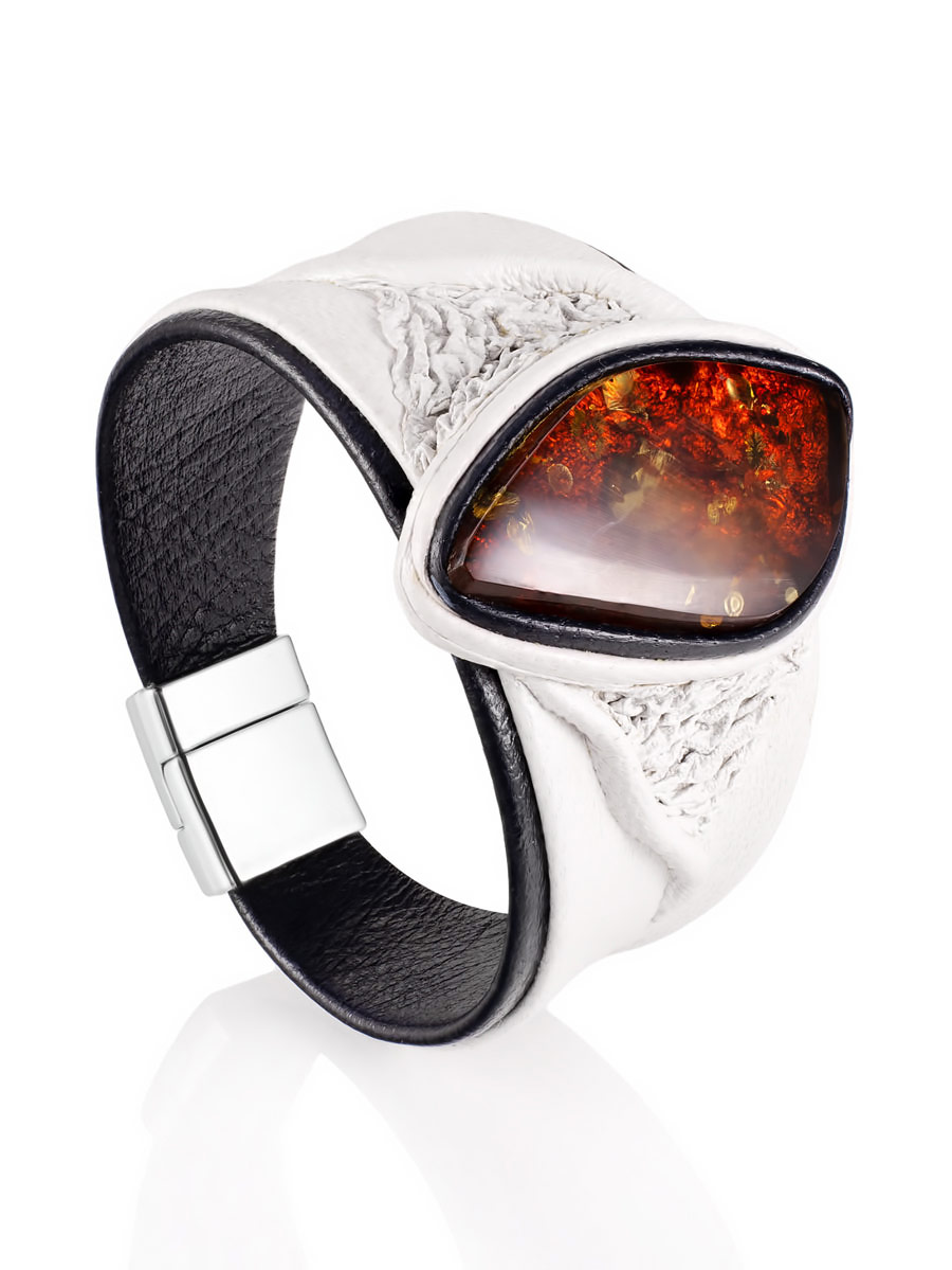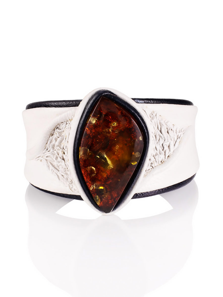 Стильный браслет-манжета «Амазонка» из белой кожи и искрящегося янтаря