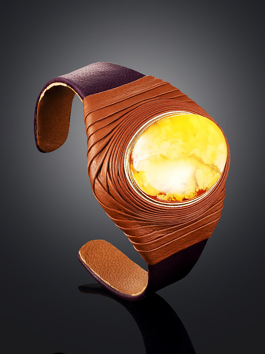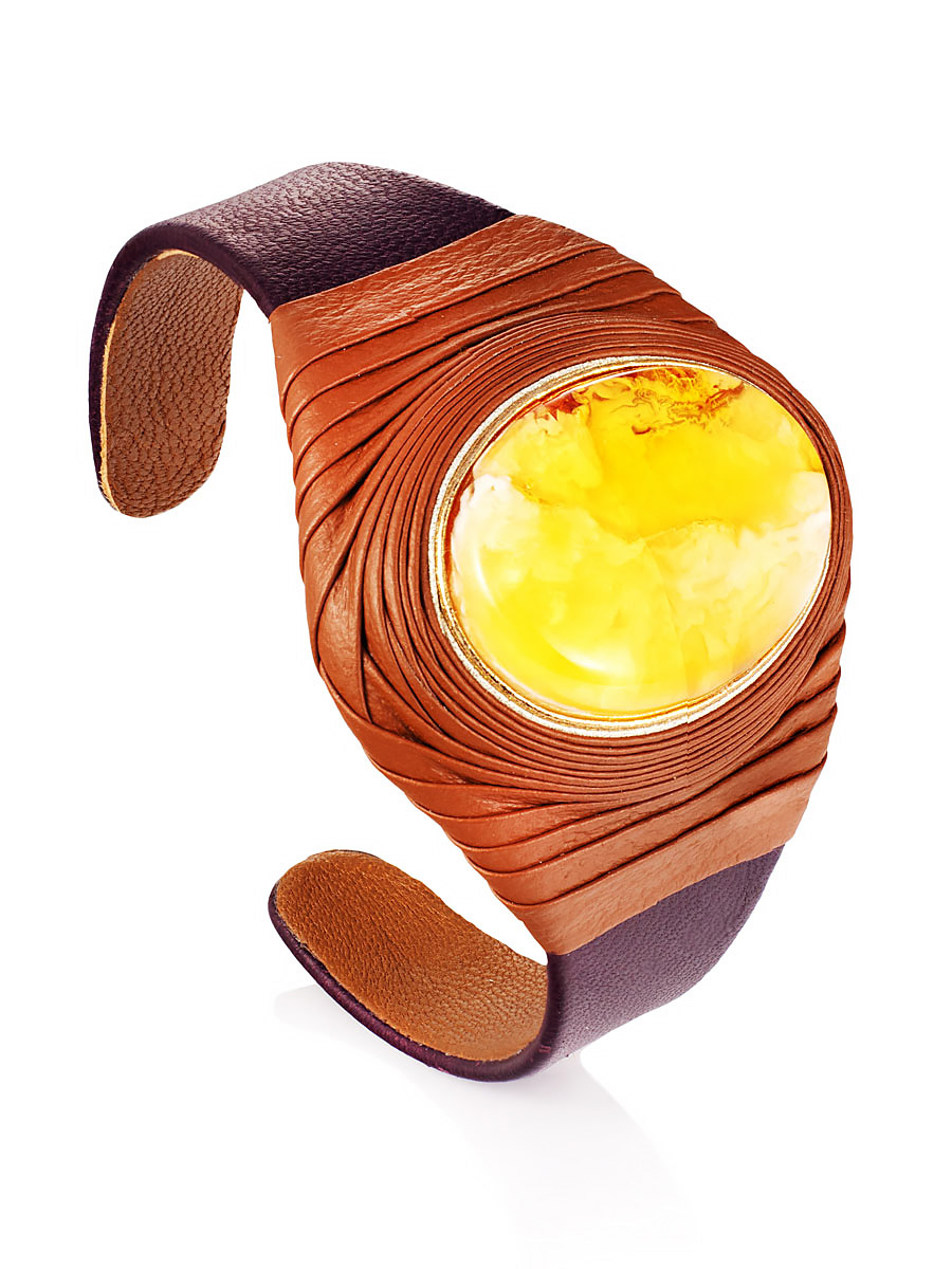 Стильный браслет-манжета «Нефертити» из кожи, украшенный пейзажным янтарём