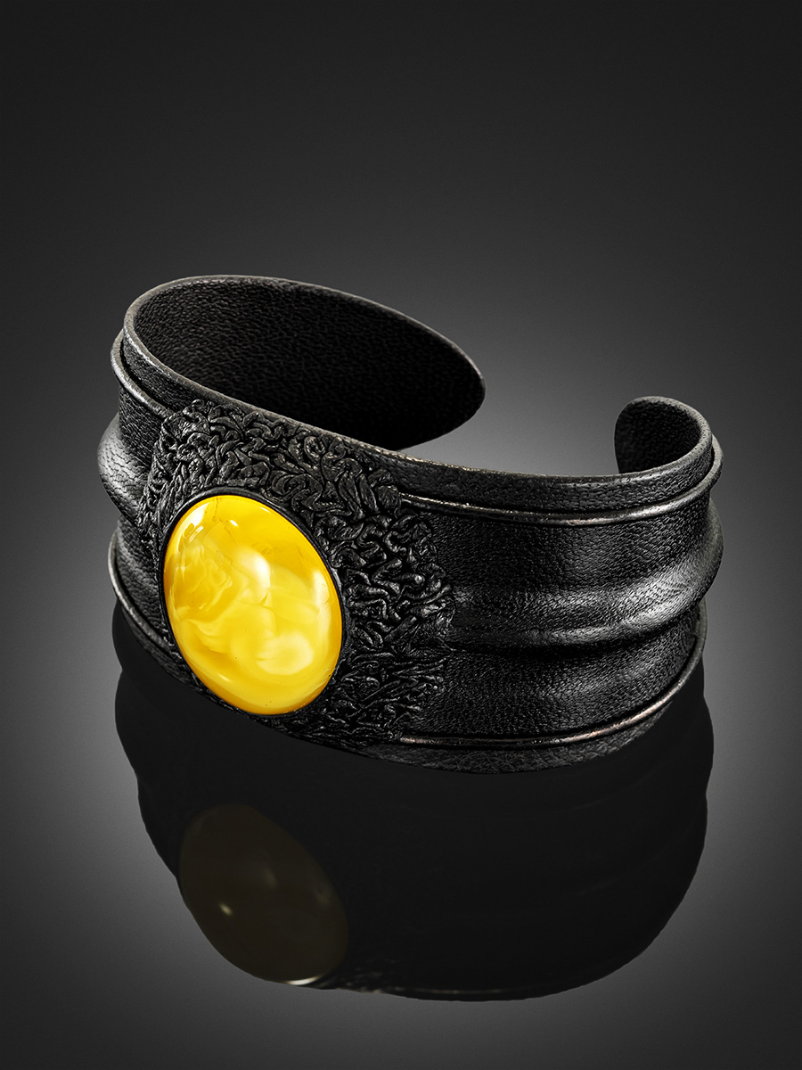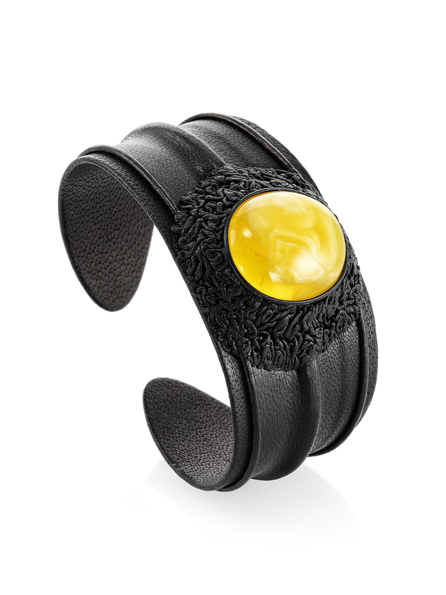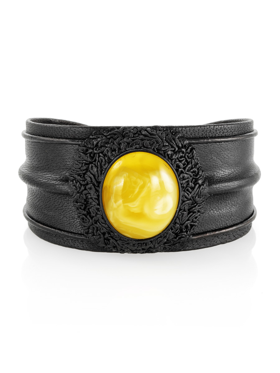 Стильный кожаный браслет со вставкой из натурального янтаря «Нефертити»