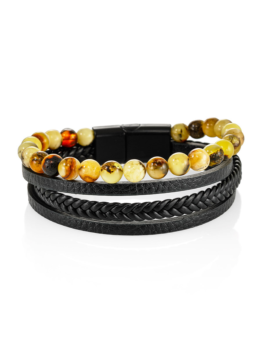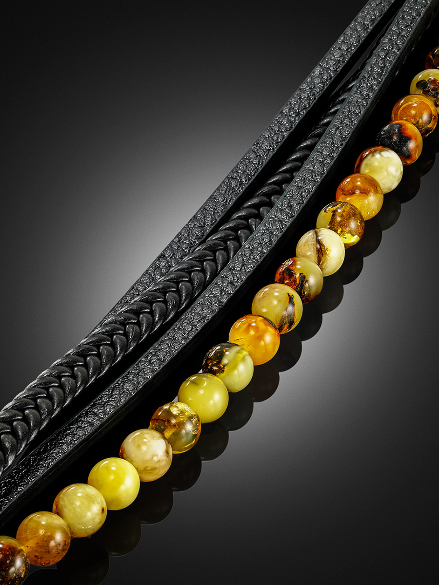 Стильный мужской браслет из кожи и янтаря «Сильверстоун»