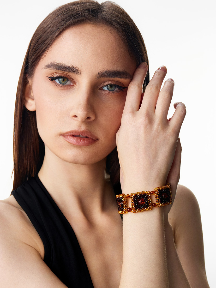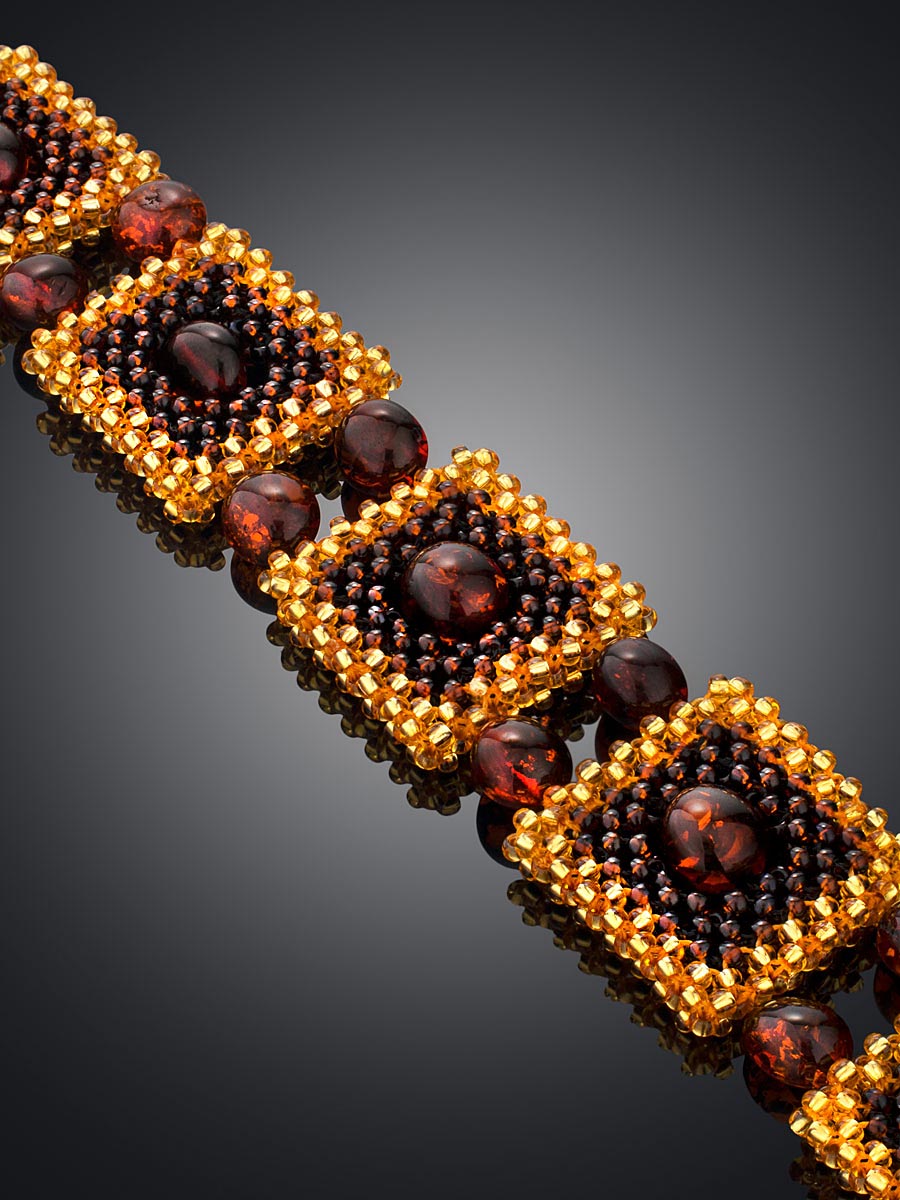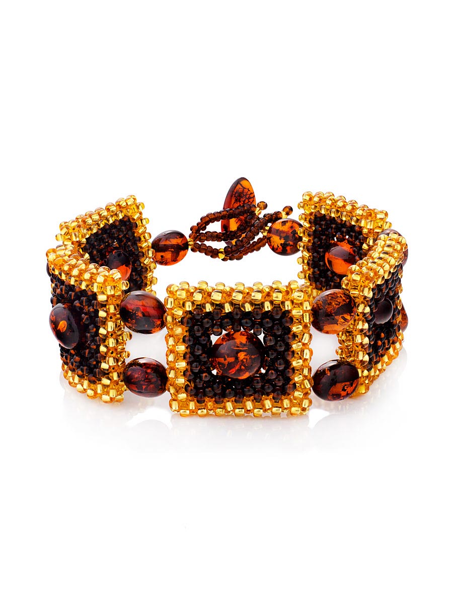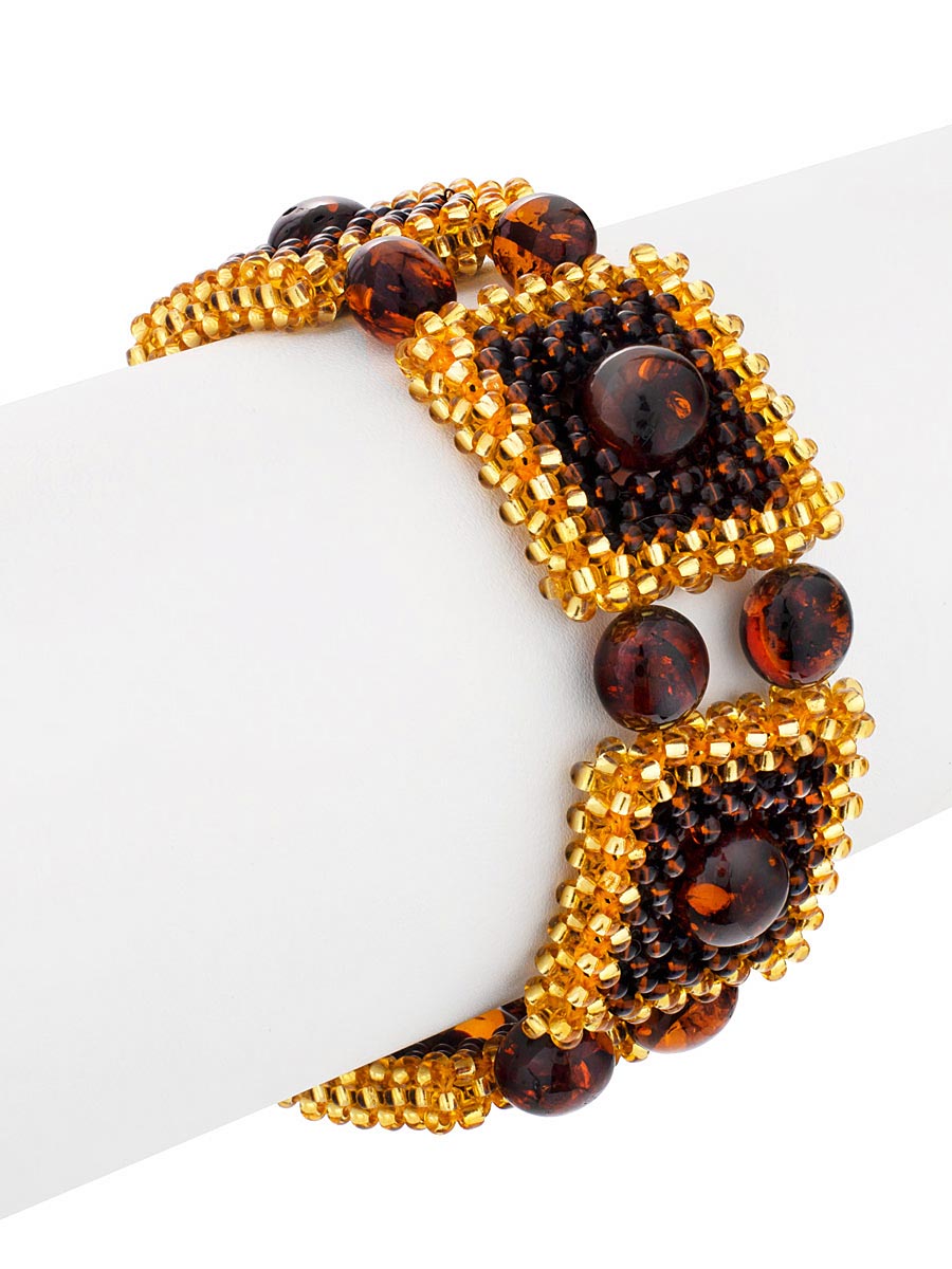 Стильный плетеный браслет из бисера с натуральным янтарём «Лукоморье»