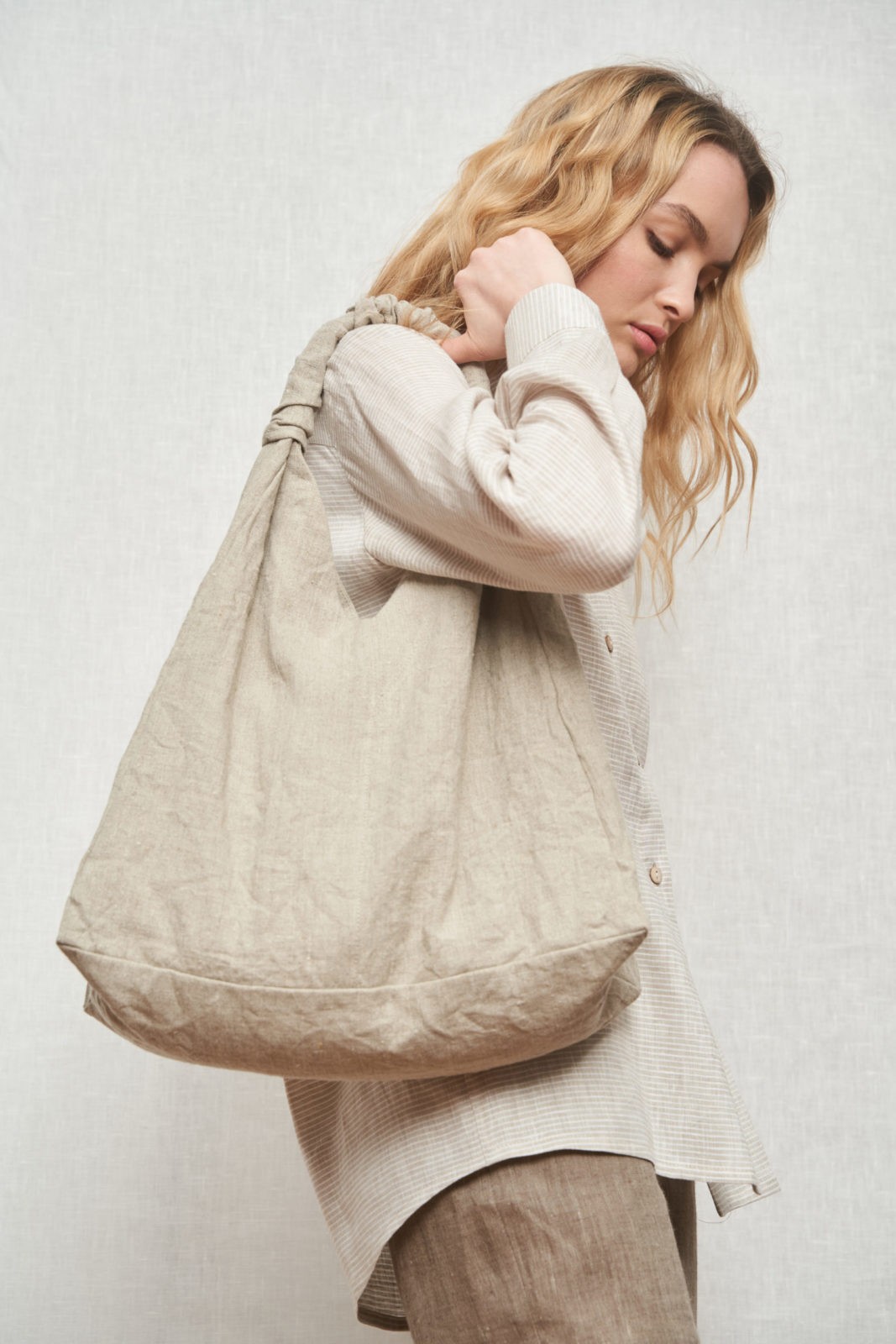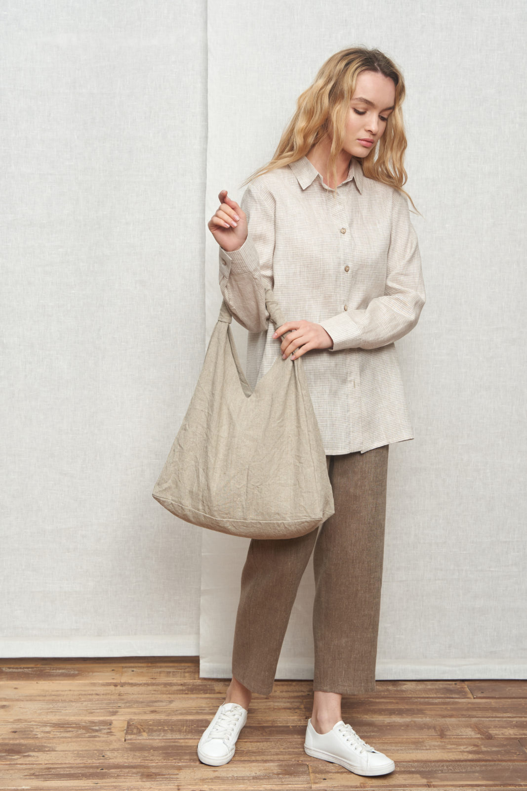 Сумка-хобо мягкой формы изо льна с одной лямкой через плечо. Внутри одно основное отделение с карманами. Размер 41х36х16 см