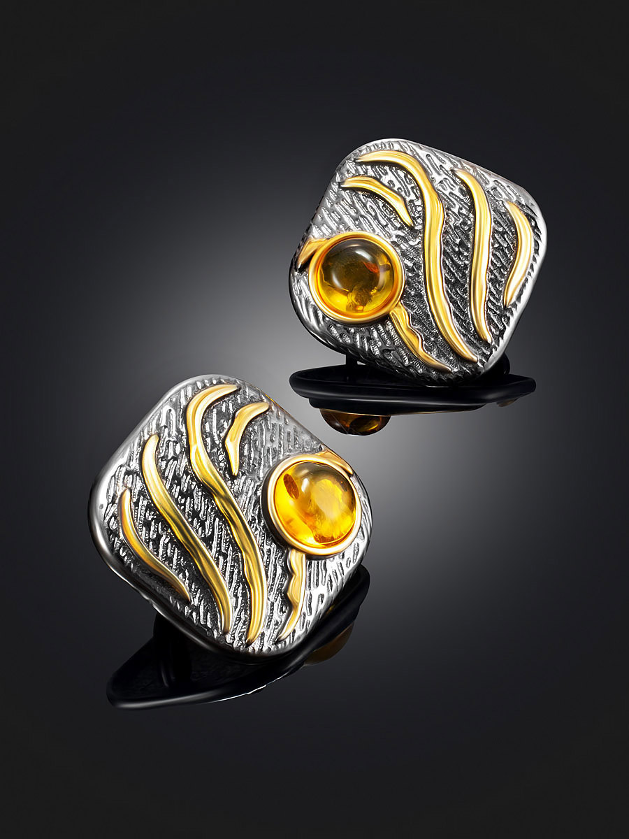 Текстурные чернёные серьги «Эритрея» с золотистым янтарём