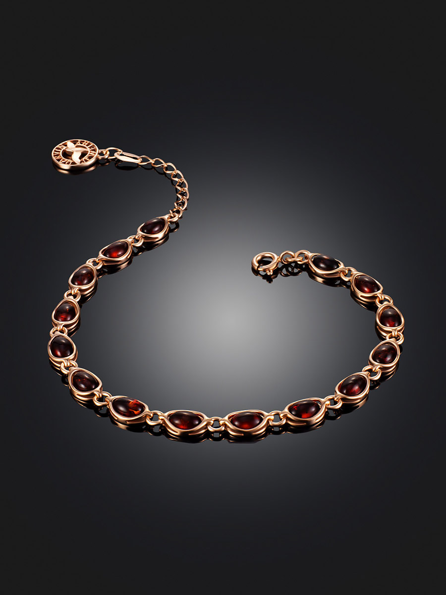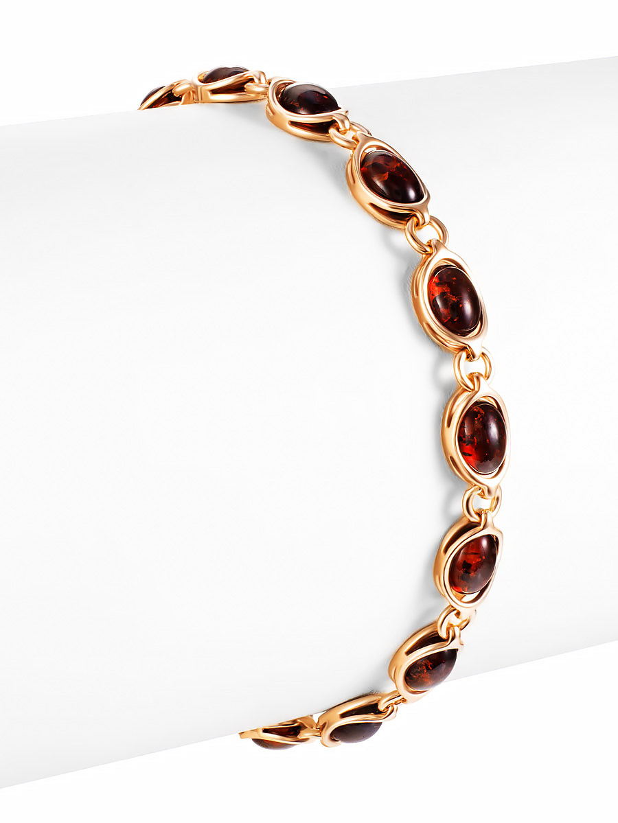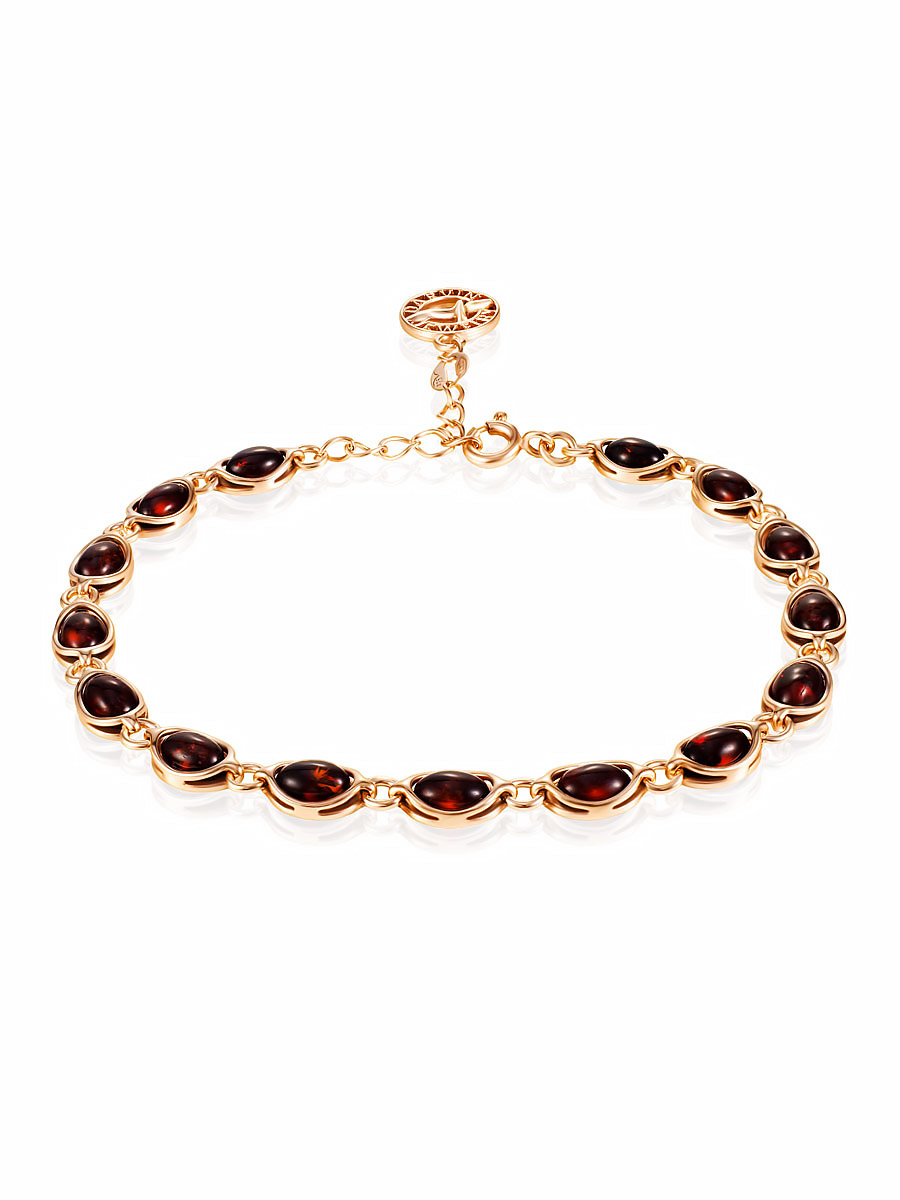 Тонкий позолоченный браслет «Амиго» с натуральным янтарём вишнёвого цвета