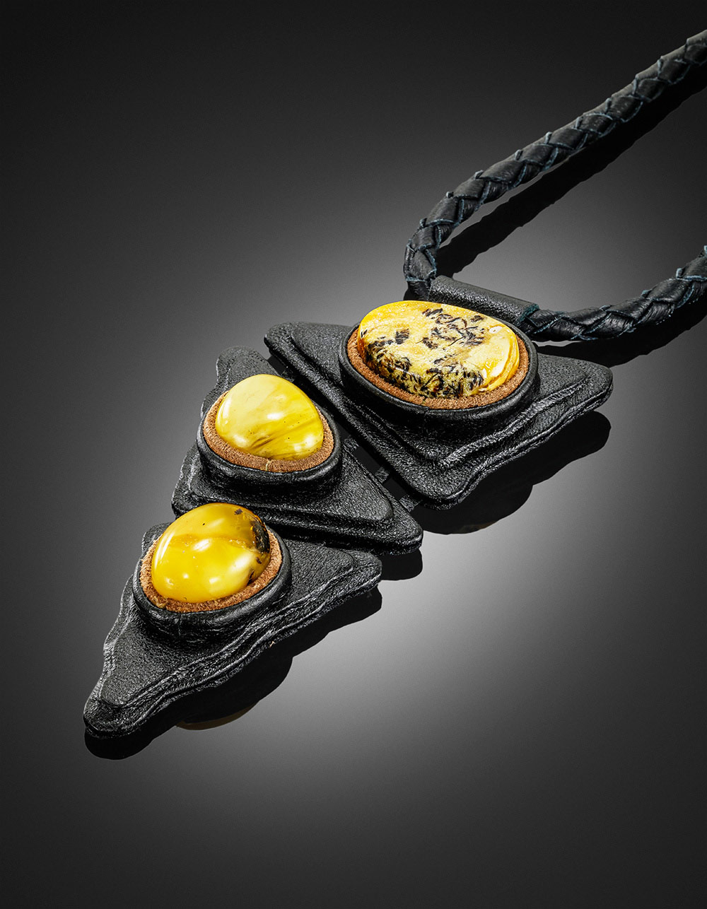 Тройное колье из кожи «Амазонка» с пейзажным янтарём