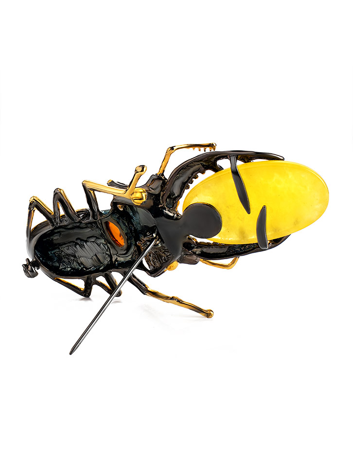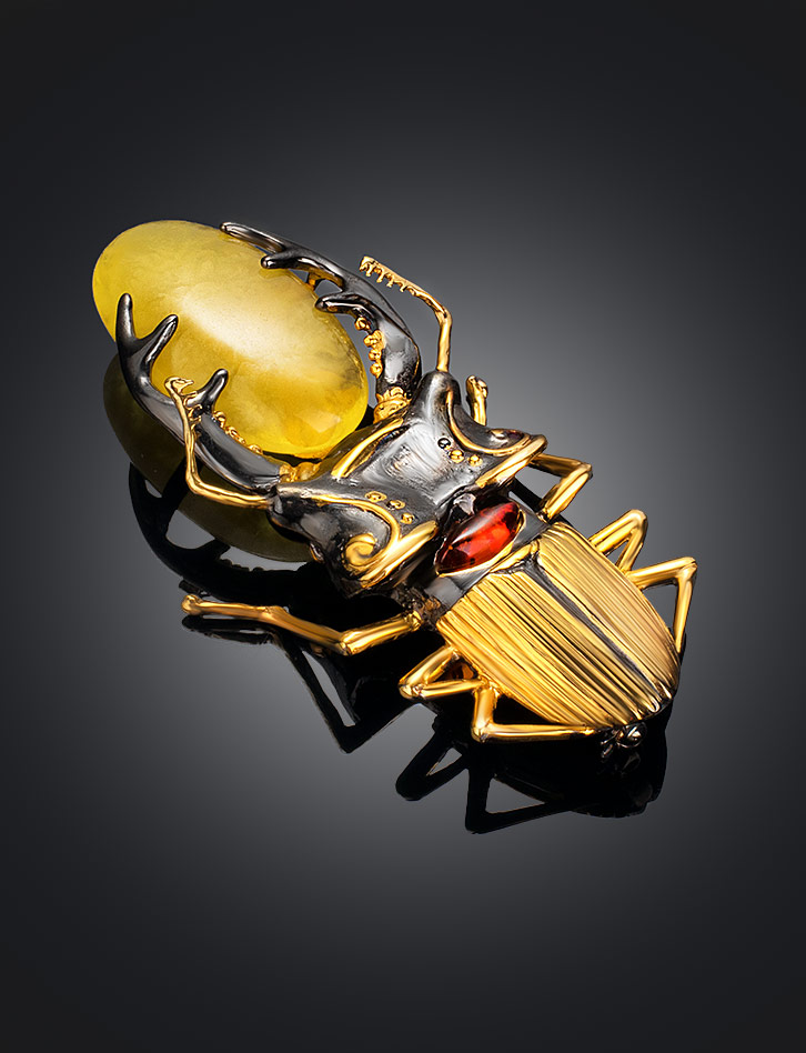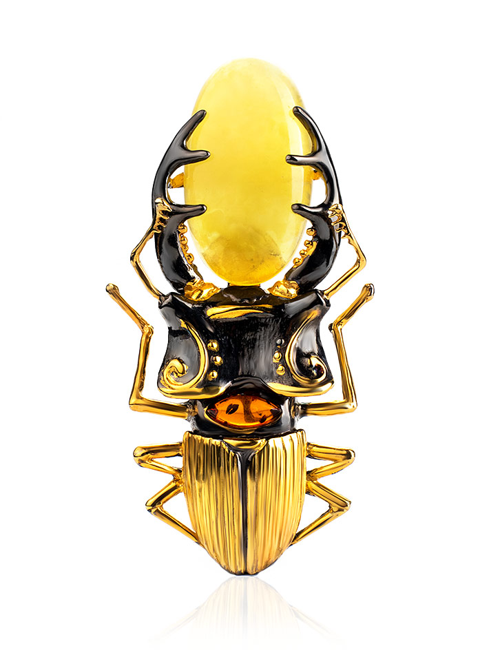 Удивительная объёмная брошь из натурального янтаря в позолоченной оправе «Жук-олень»