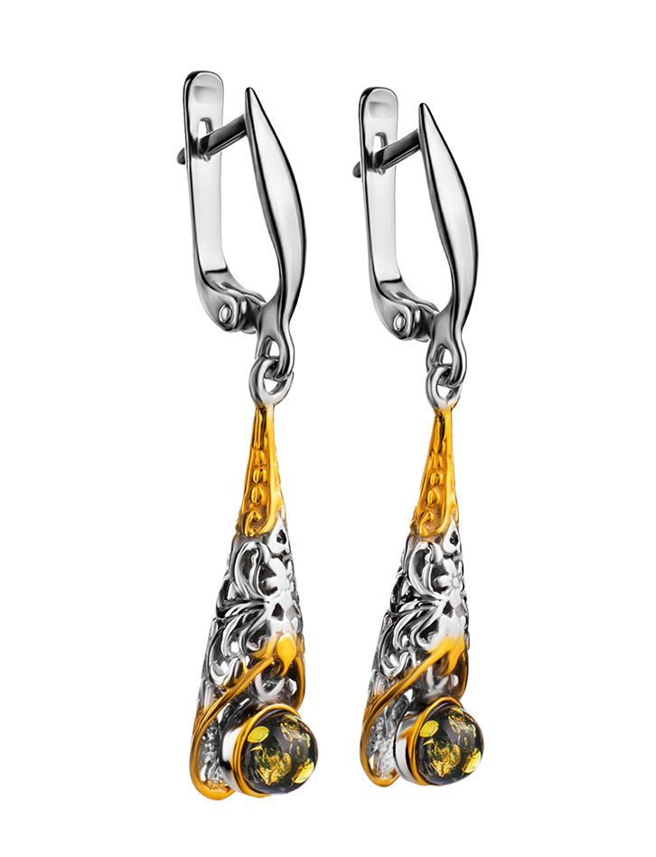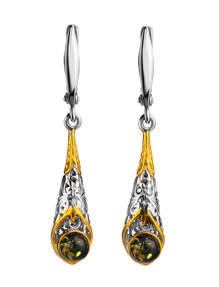 Удлинённые серьги «Роксана» с натуральным балтийским янтарём зелёного цвета