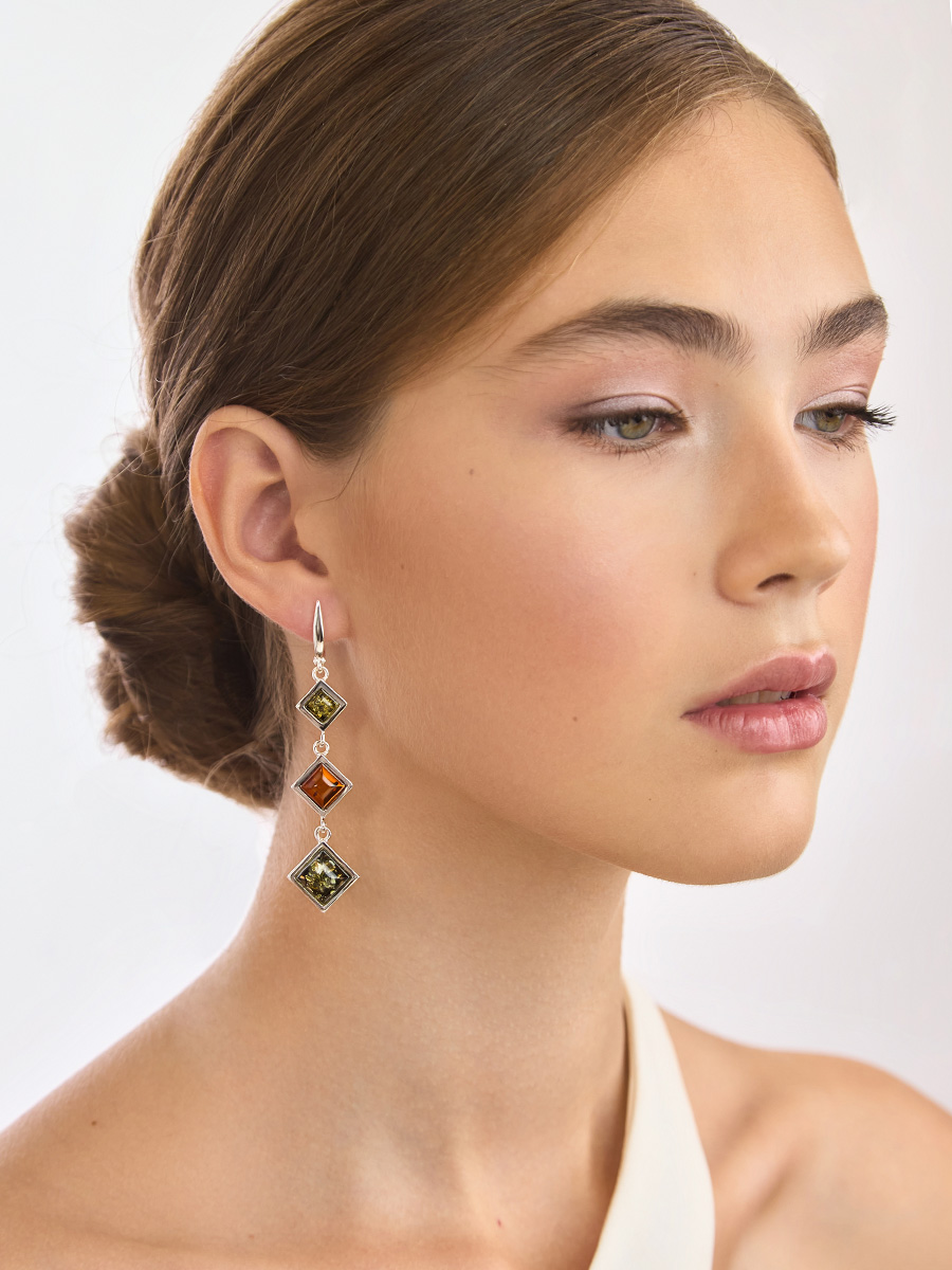 Удлинённые серьги с янтарём разных оттенков «Каледония»