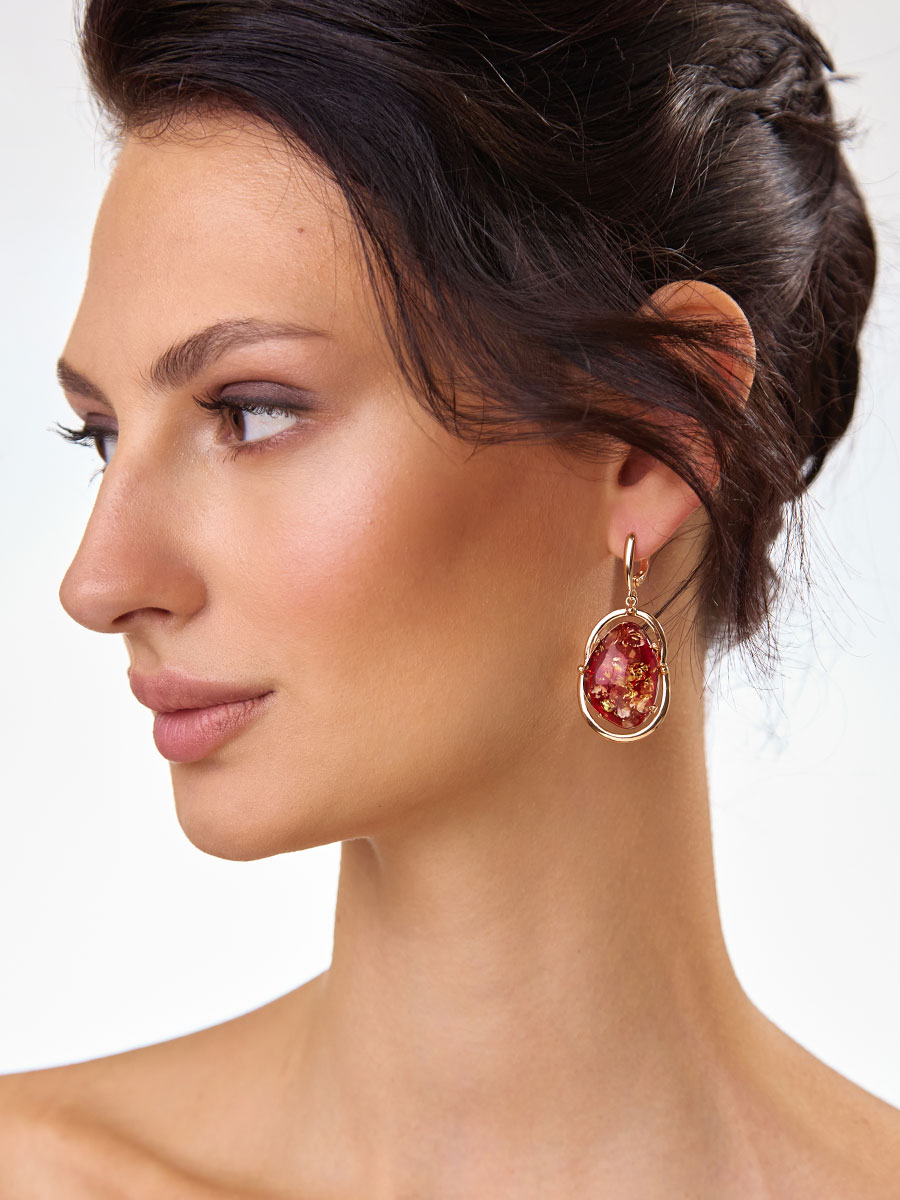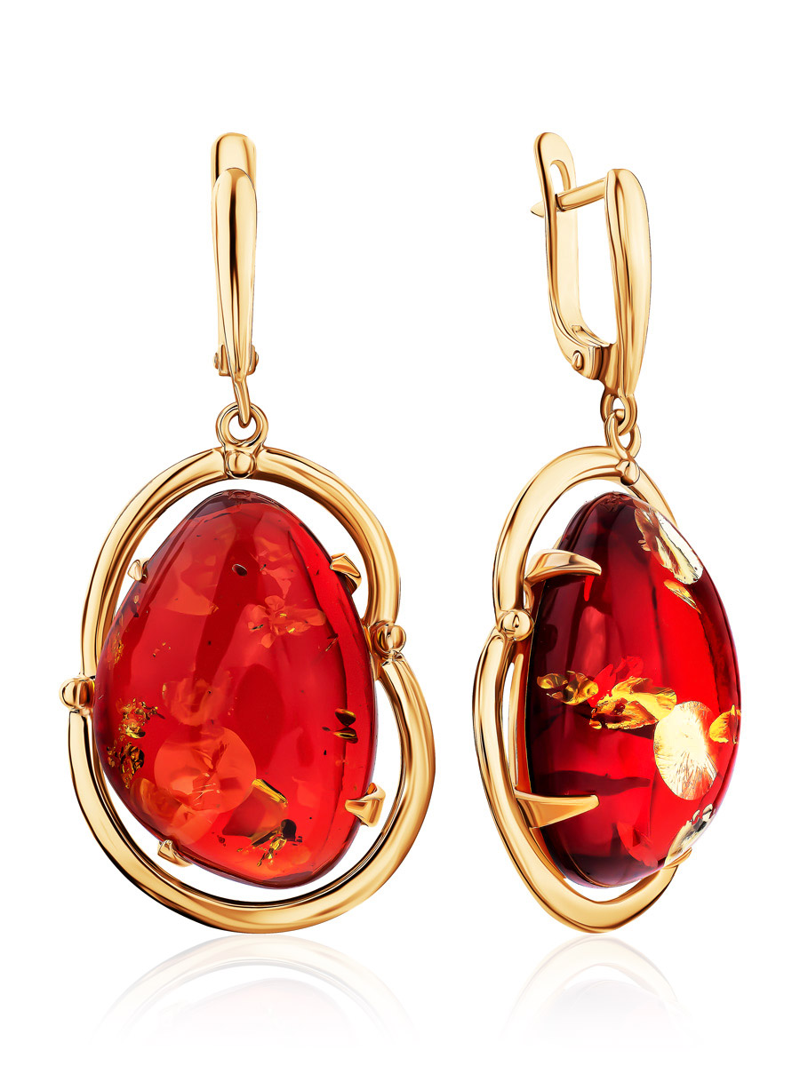 Великолепные серьги «Лагуна» из золочёного серебра и цельного красного янтаря