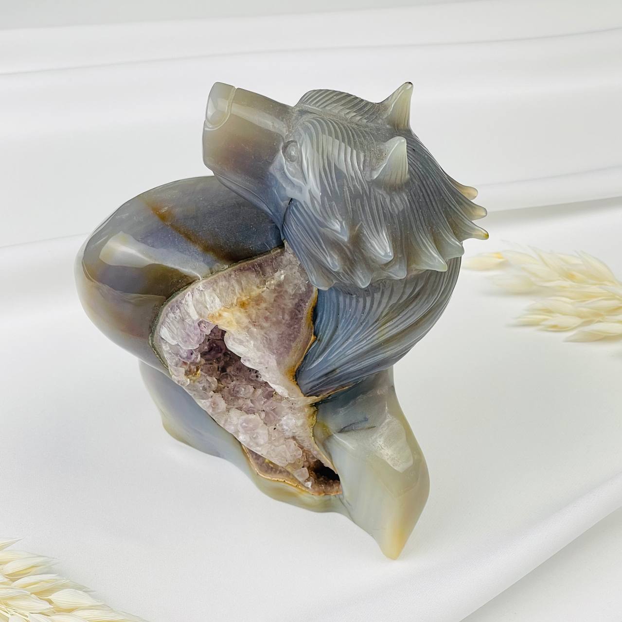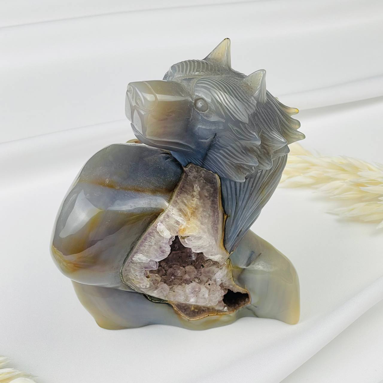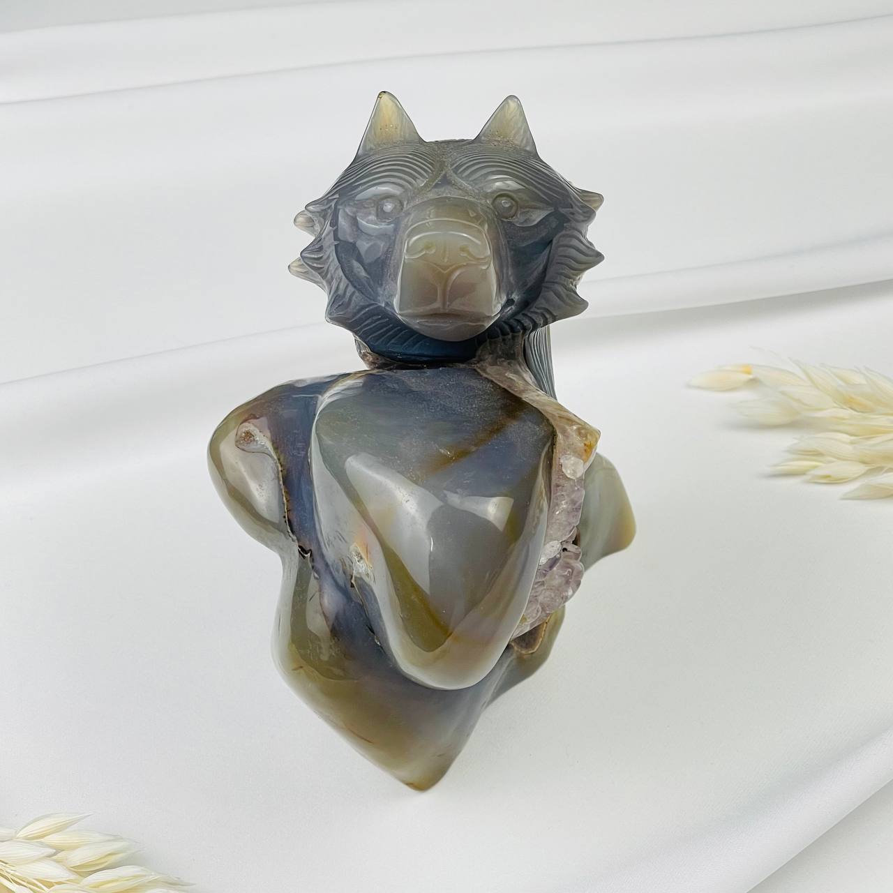 Радуга Самоцветов Волк резной из камня Агат серый с жеодой