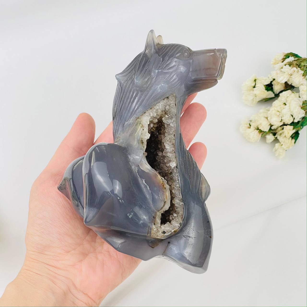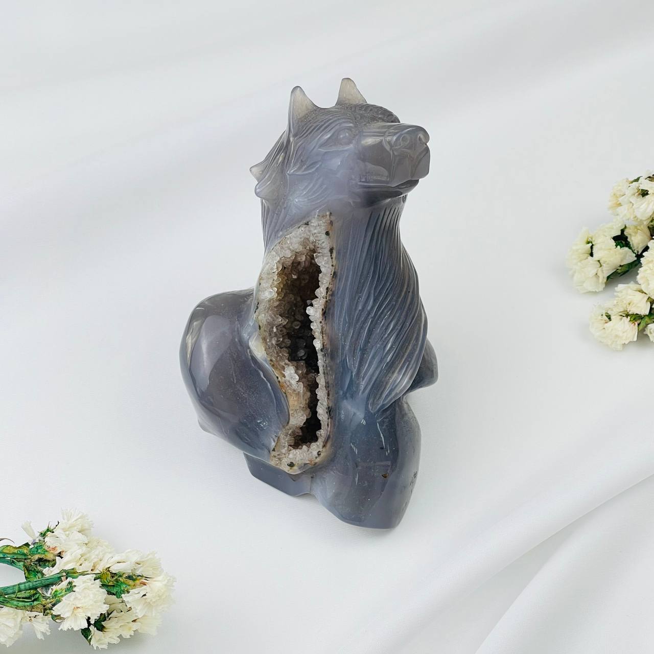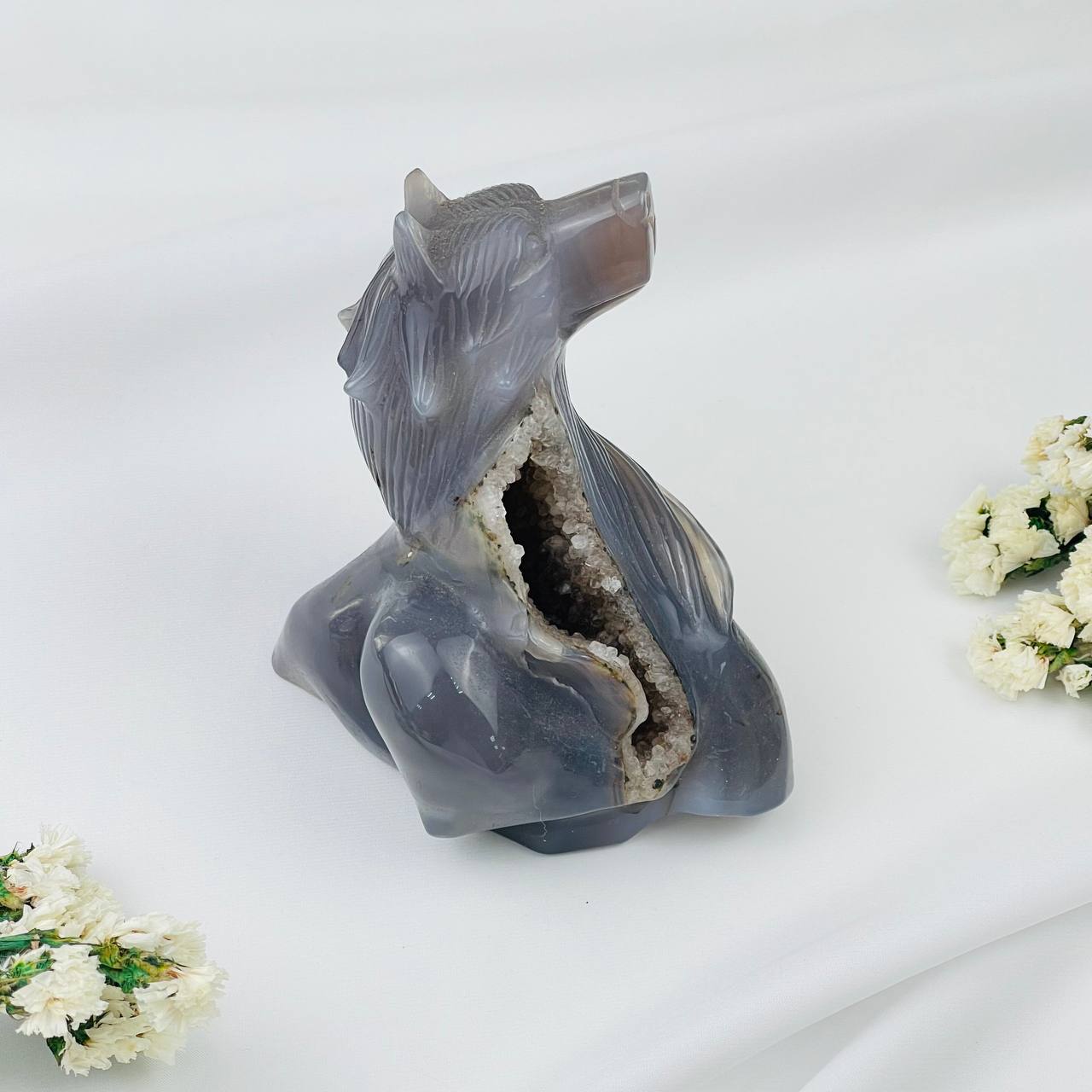 Радуга Самоцветов Волк резной из камня Агат серый с жеодой