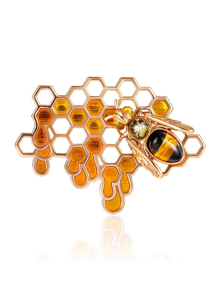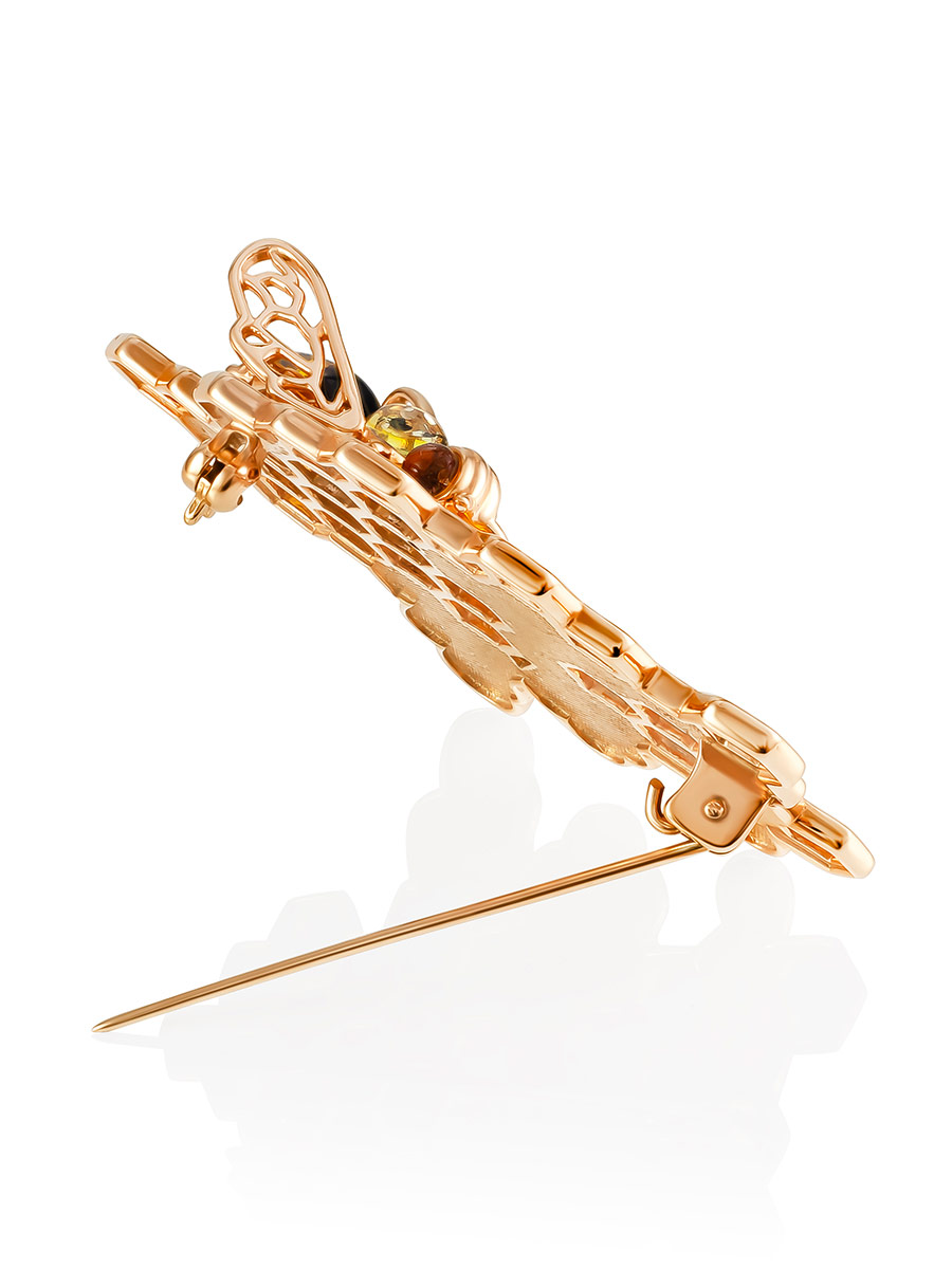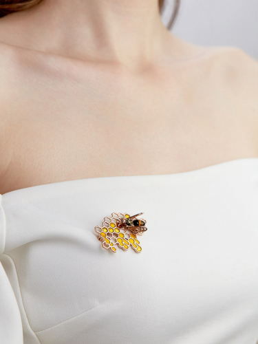 Яркая и необычная позолоченная брошь с эмалью и янтарной пчелой «Винни Пух»
