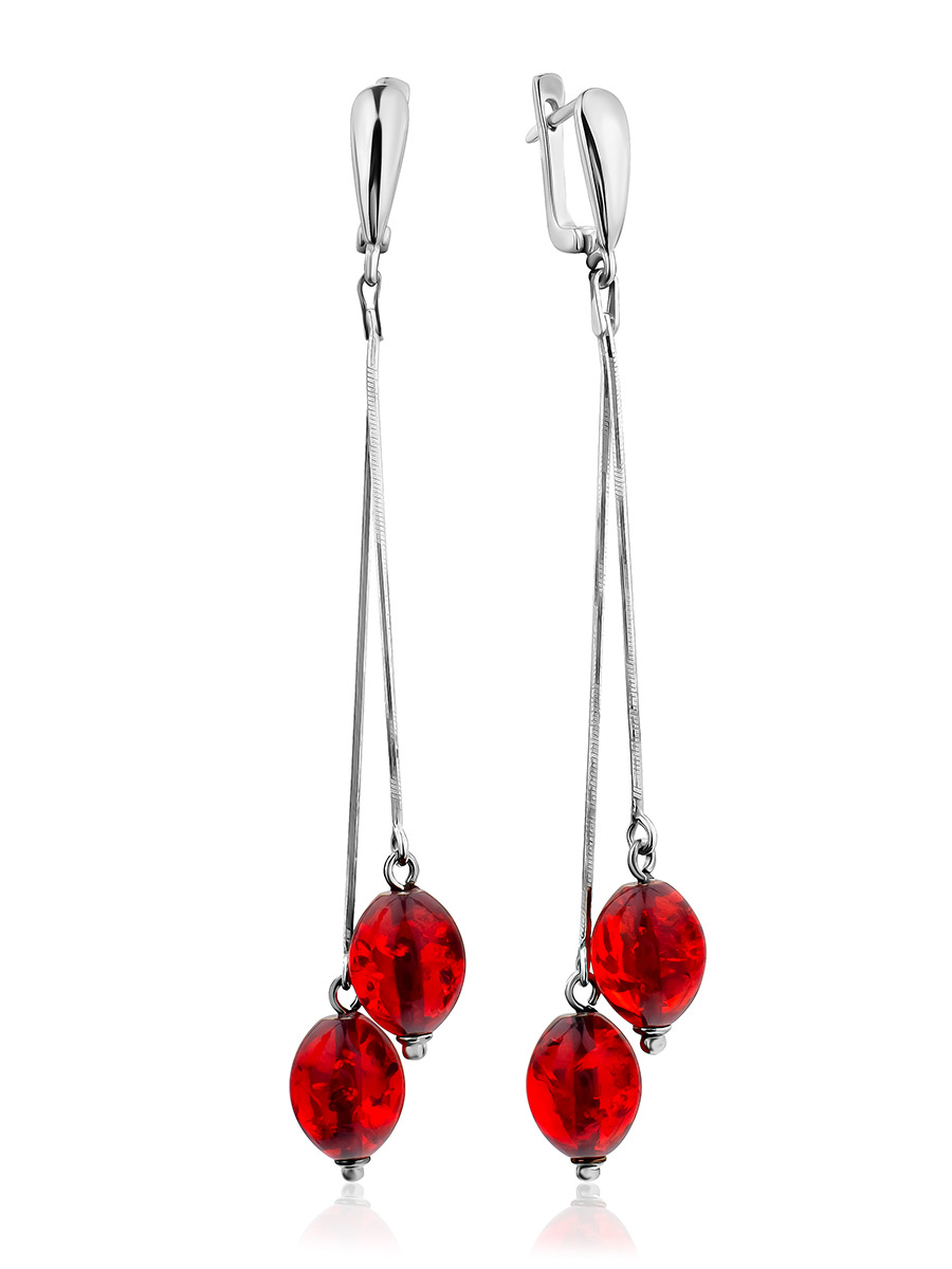 Яркие длинные серьги с янтарём красного цвета «Рябина»