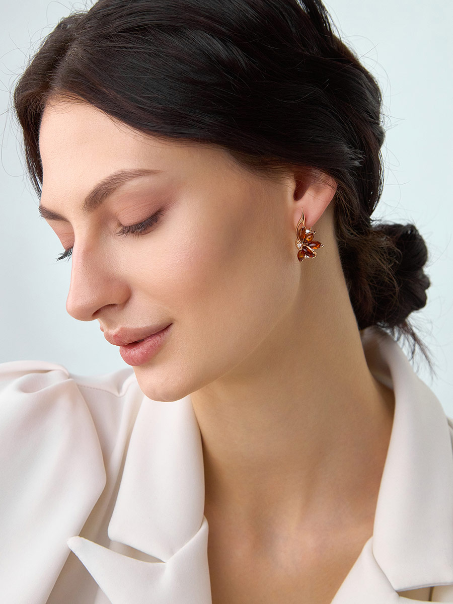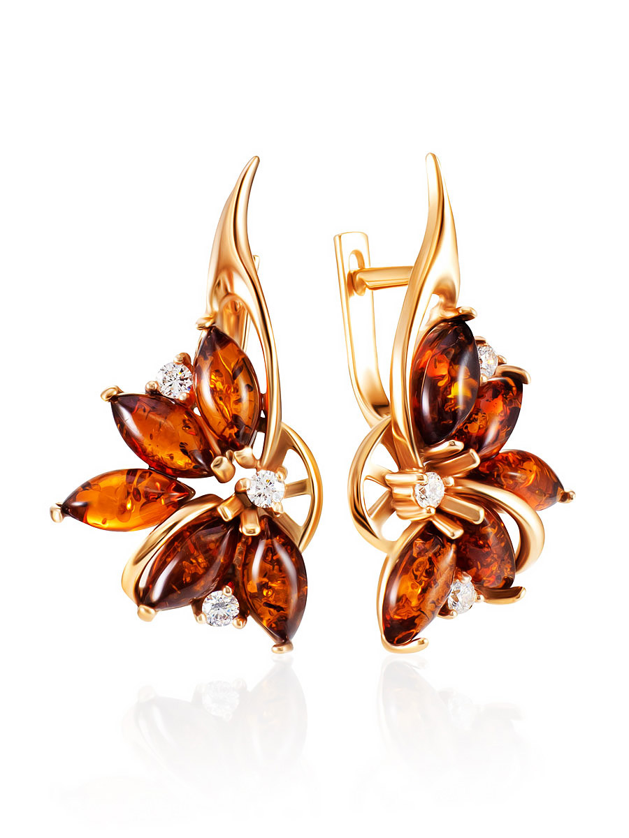 Яркие серьги с натуральным янтарём и кристаллами «Лотос»