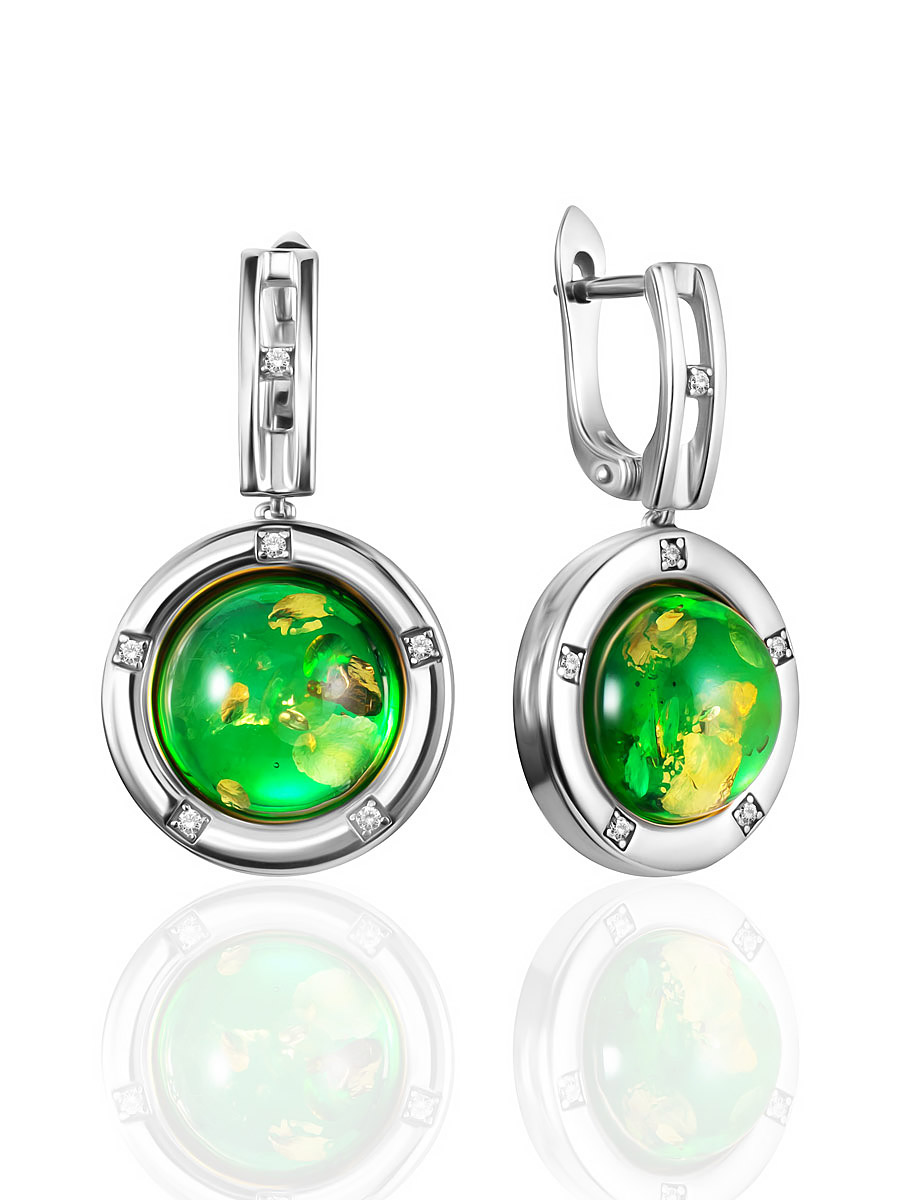 Яркие серьги с янтарём изумрудного цвета и кристаллами «Ампир»
