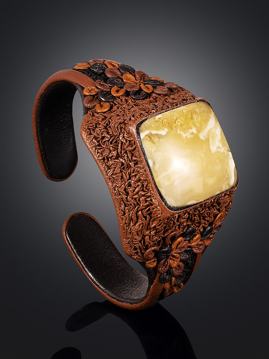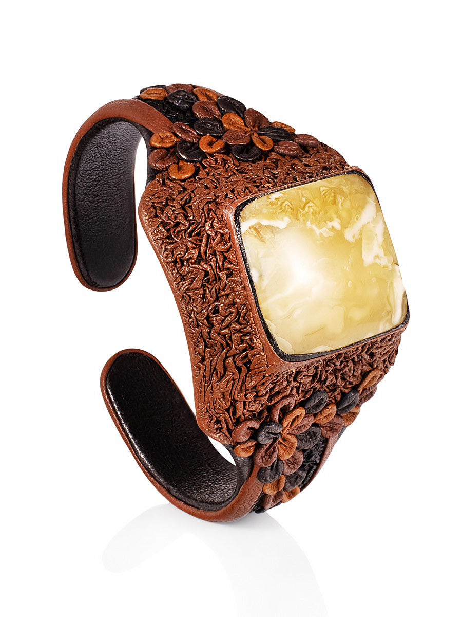 Яркий браслет из кожи с натуральным янтарём «Нефертити»