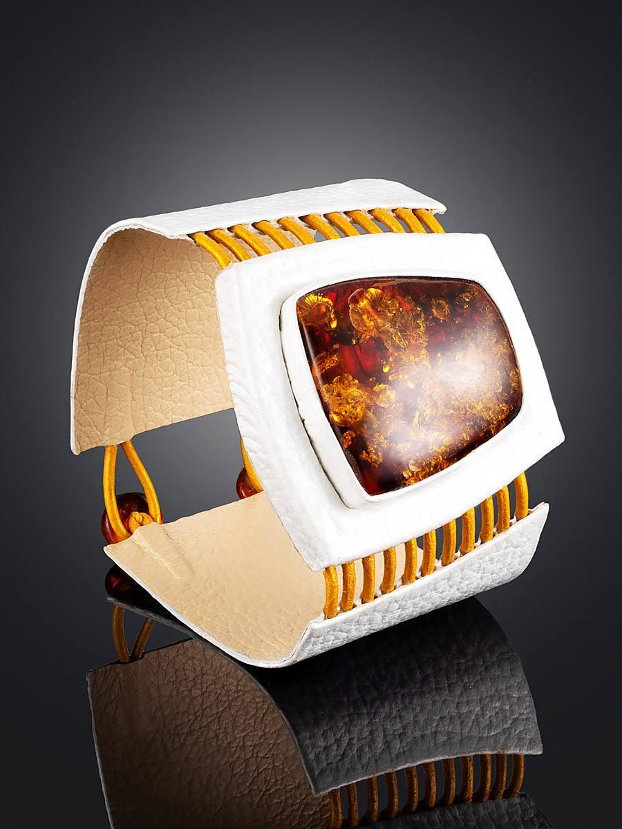 Яркий браслет-манжета «Амазонка» из белой кожи и искрящегося янтаря
