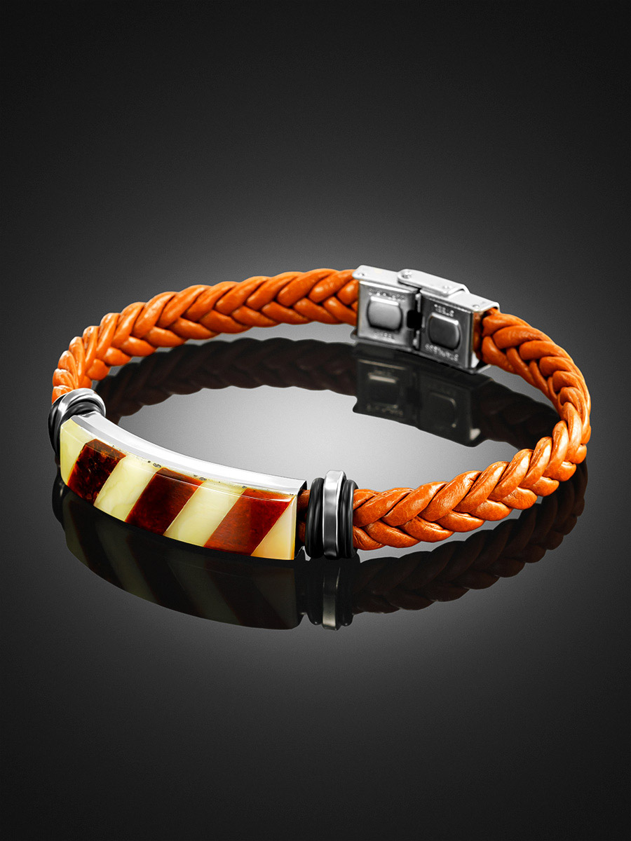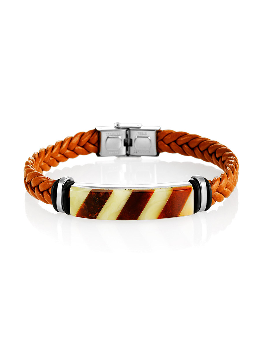 Яркий плетёный браслет из светло-коричневой кожи, украшенный янтарной мозаикой «Сильверстоун»