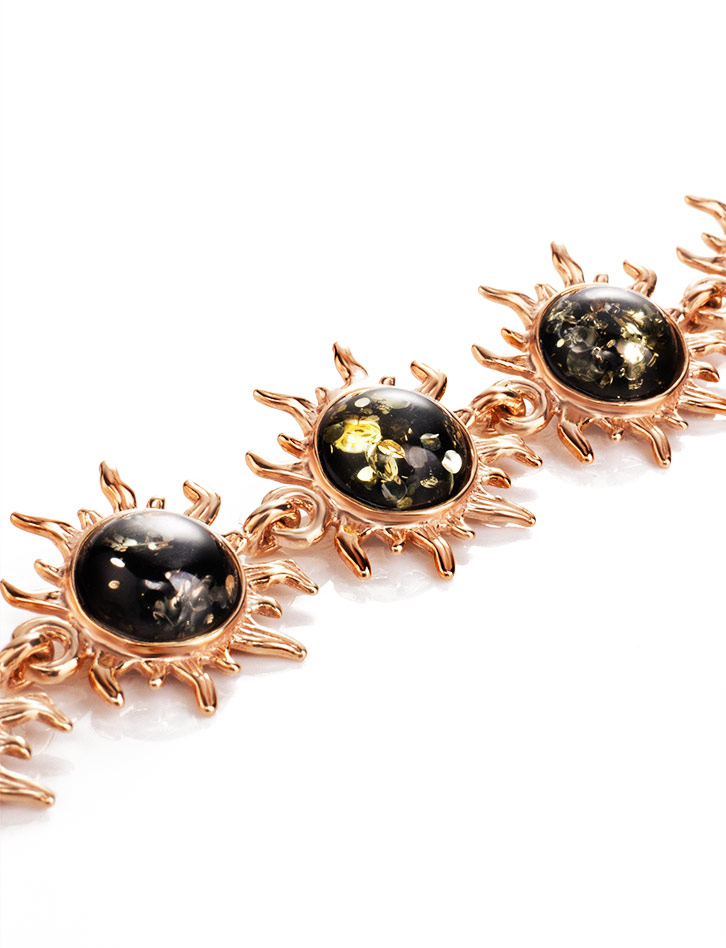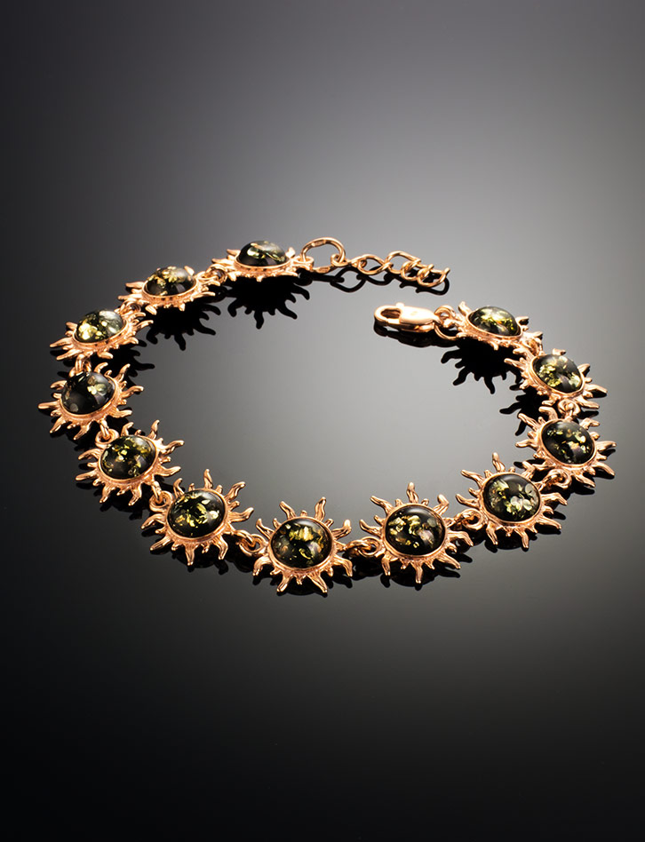 Яркий позолоченный браслет, украшенный зелёным янтарём «Гелиос»