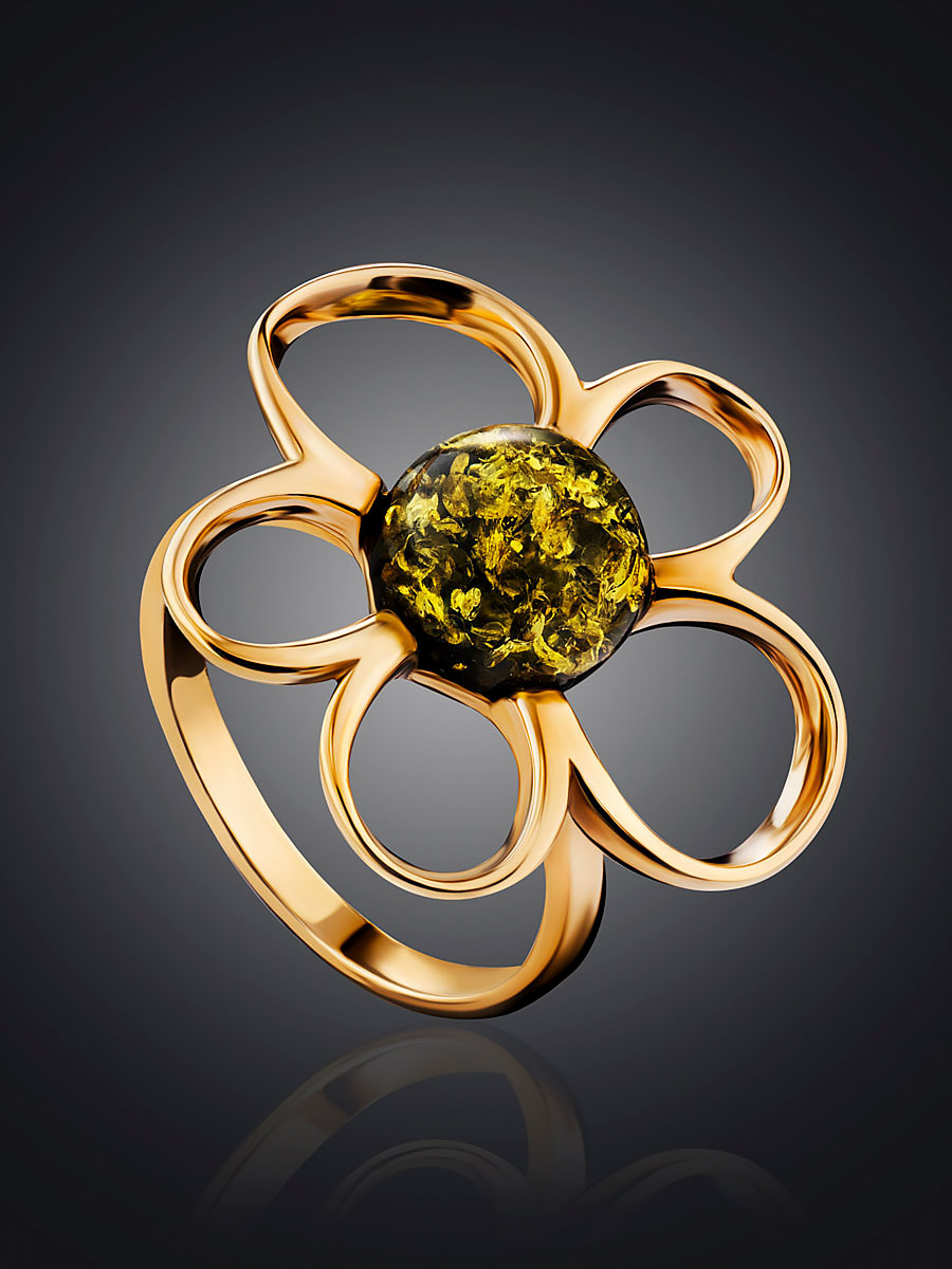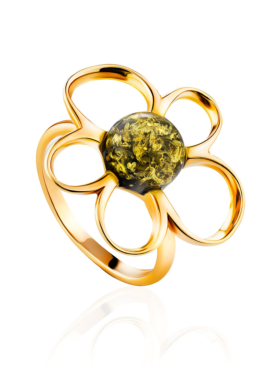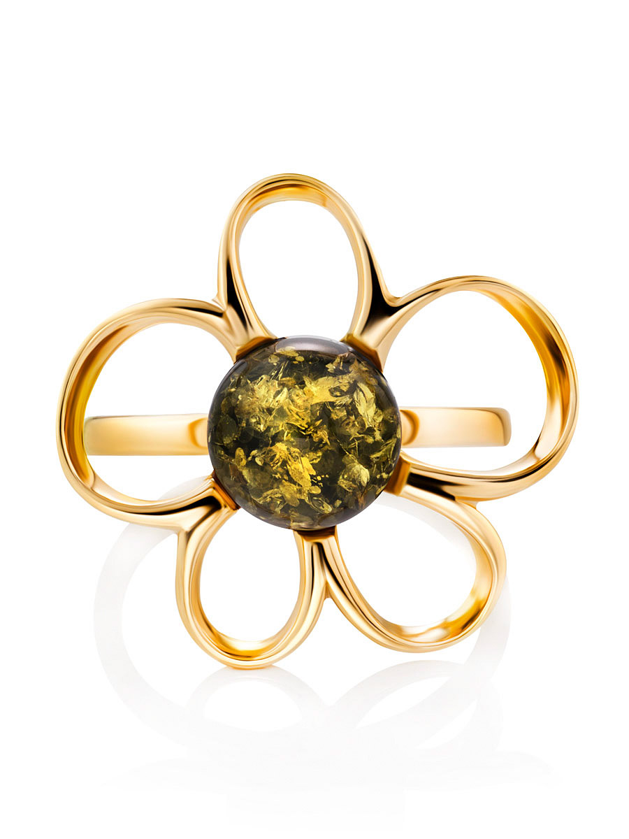Яркое кольцо «Ромашка» с натуральным зелёным янтарём