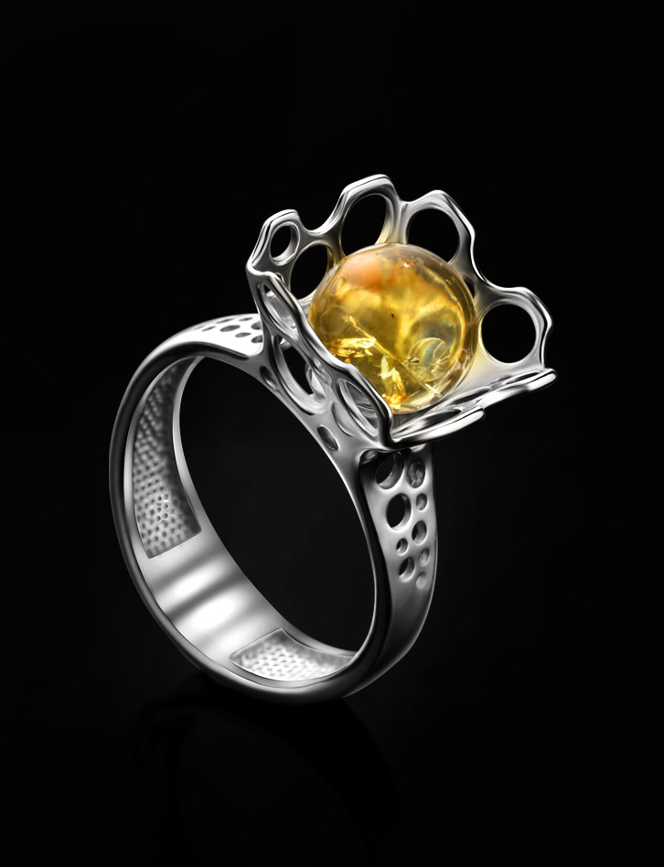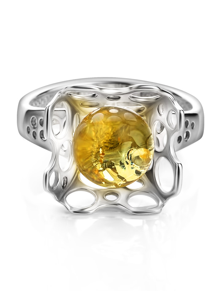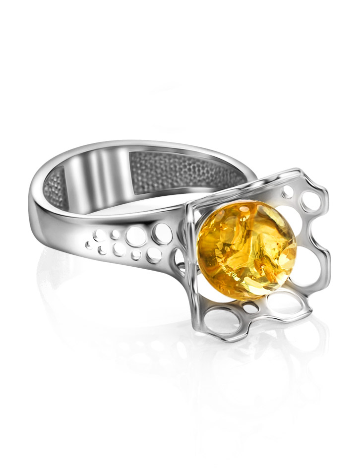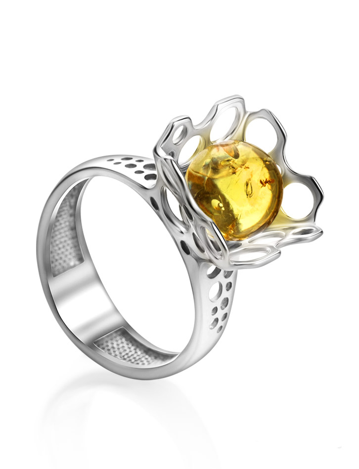 Яркое кольцо с натуральным янтарём лимонного цвета «Женева»