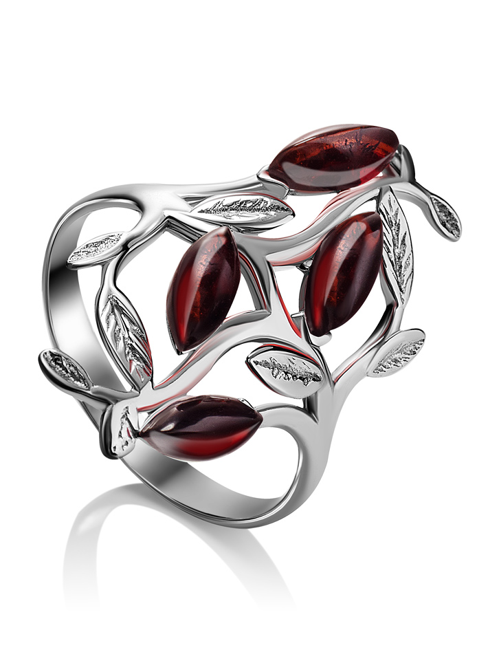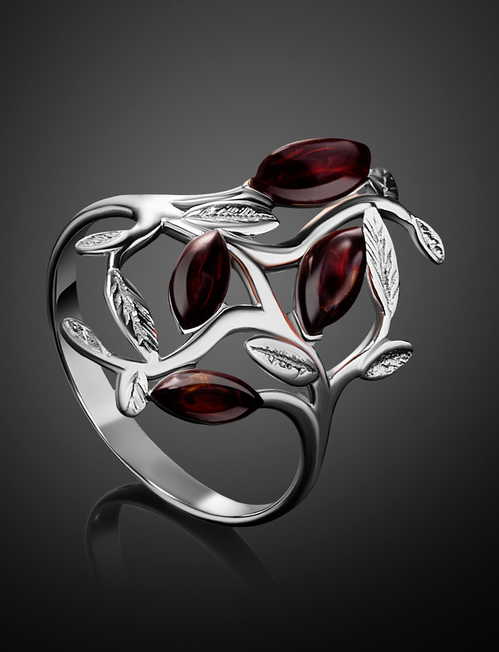 Яркое кольцо, украшенное натуральным тёмно-коньячным янтарём «Тропиканка»