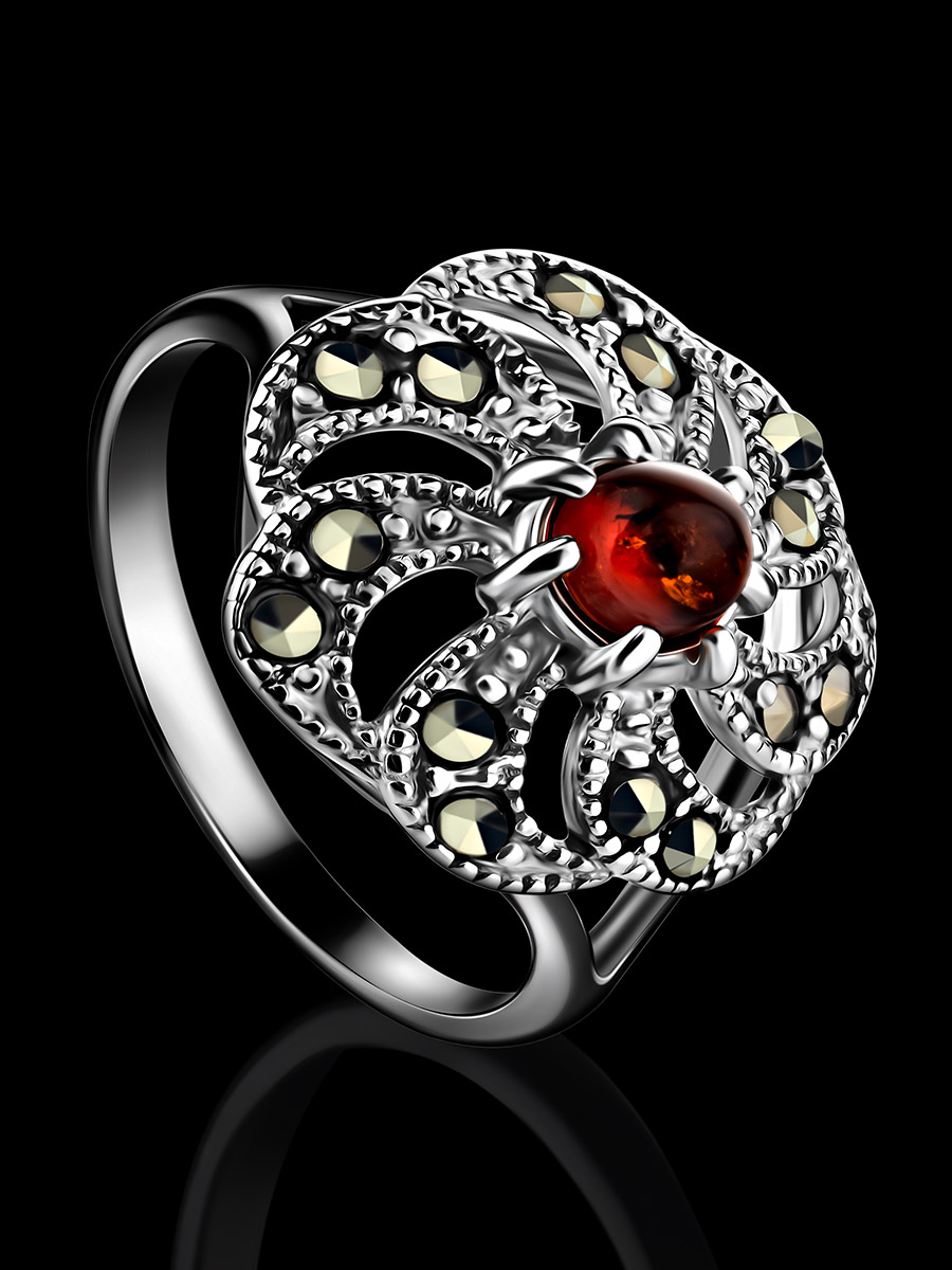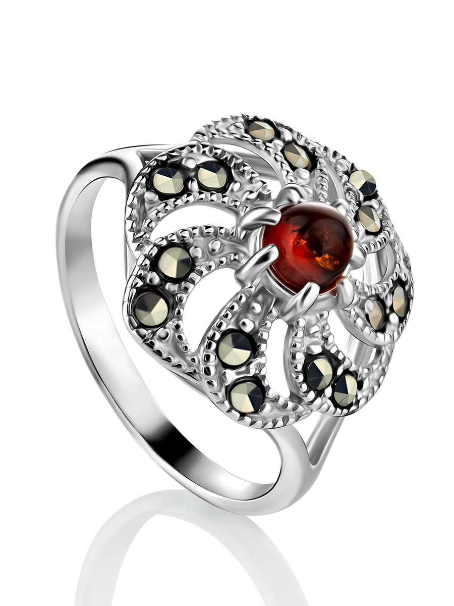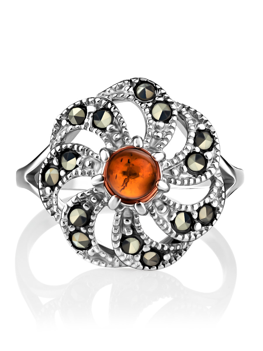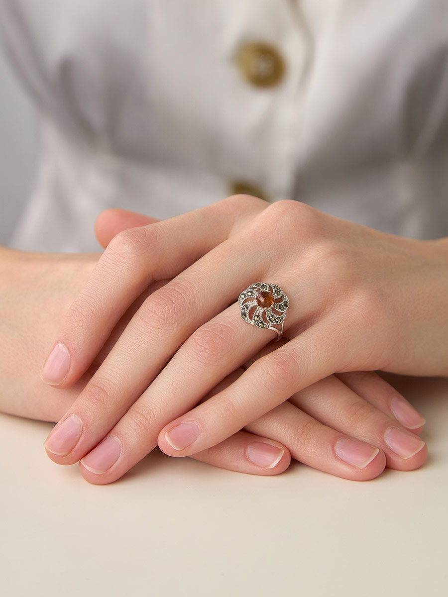 Яркое кольцо, украшенное янтарём коньячного цвета и марказитами «Эйфория»