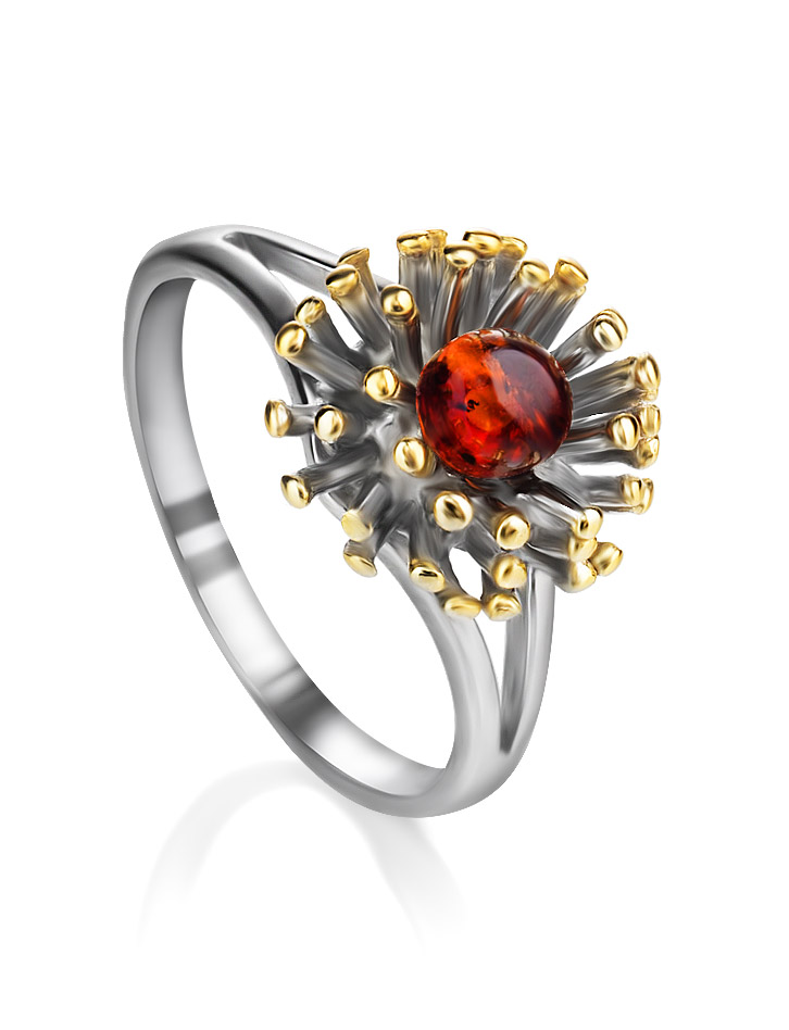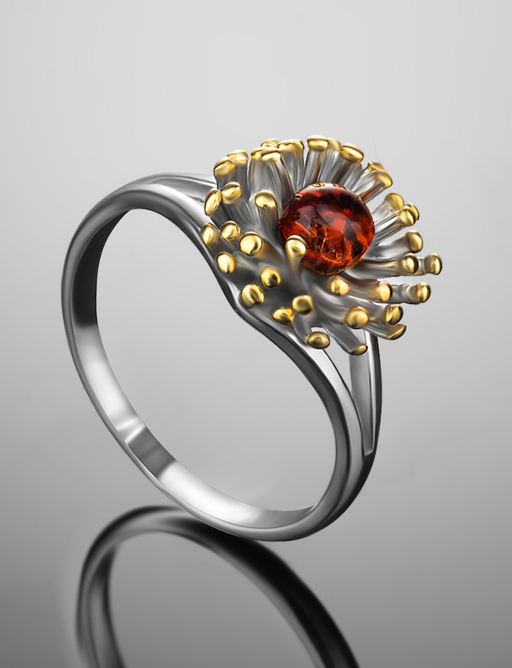 Яркое кольцо в необычном дизайне из коньячного янтаря «Барбадос»
