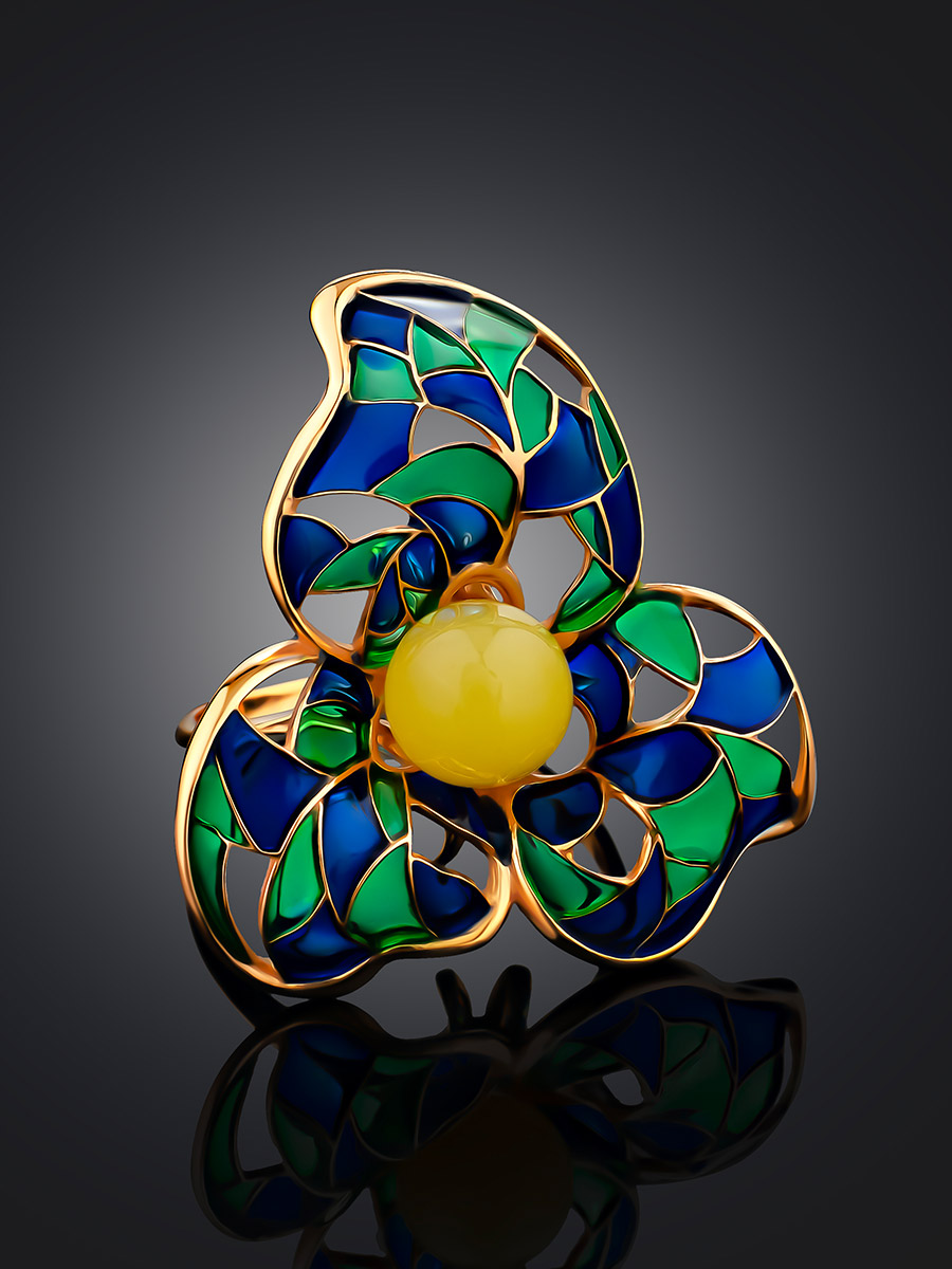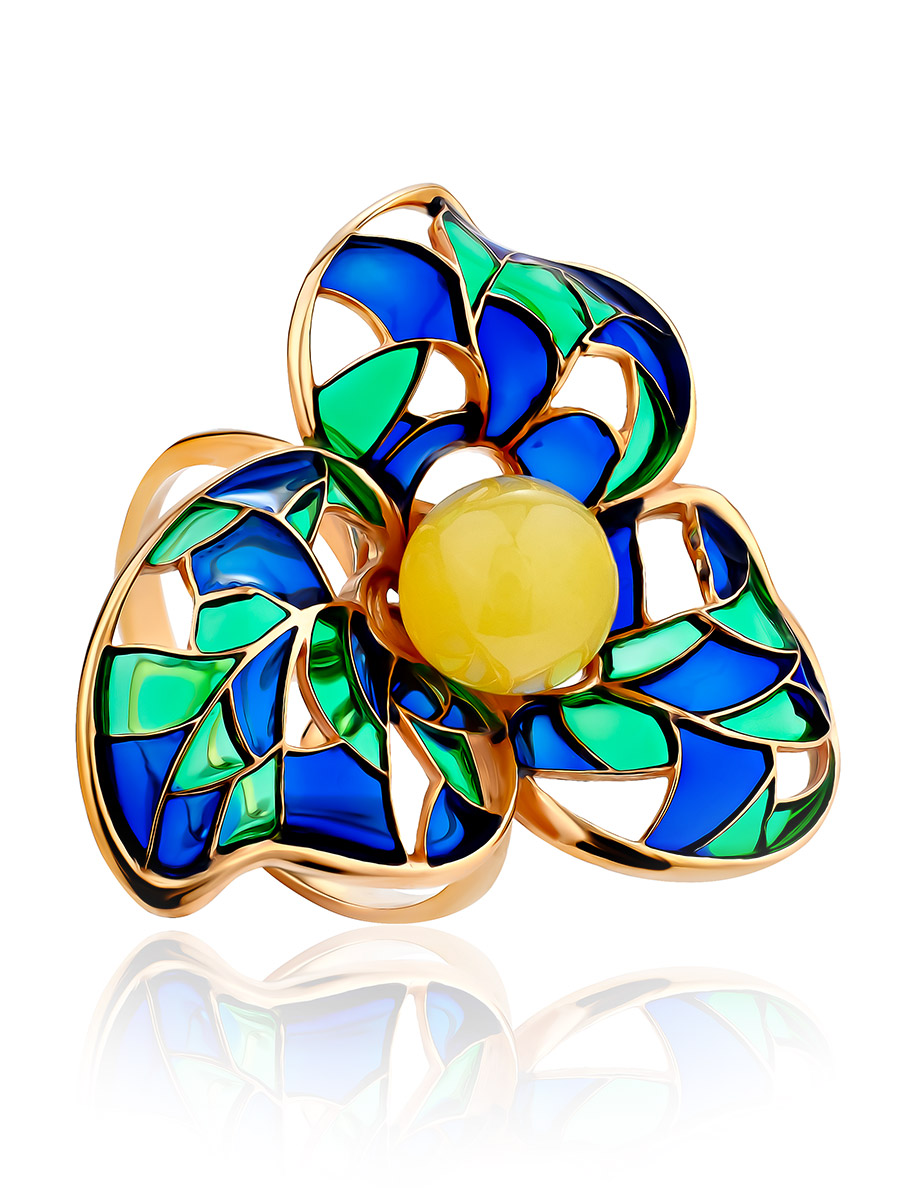 Яркое позолоченное кольцо с натуральным янтарём и эмалью Verona