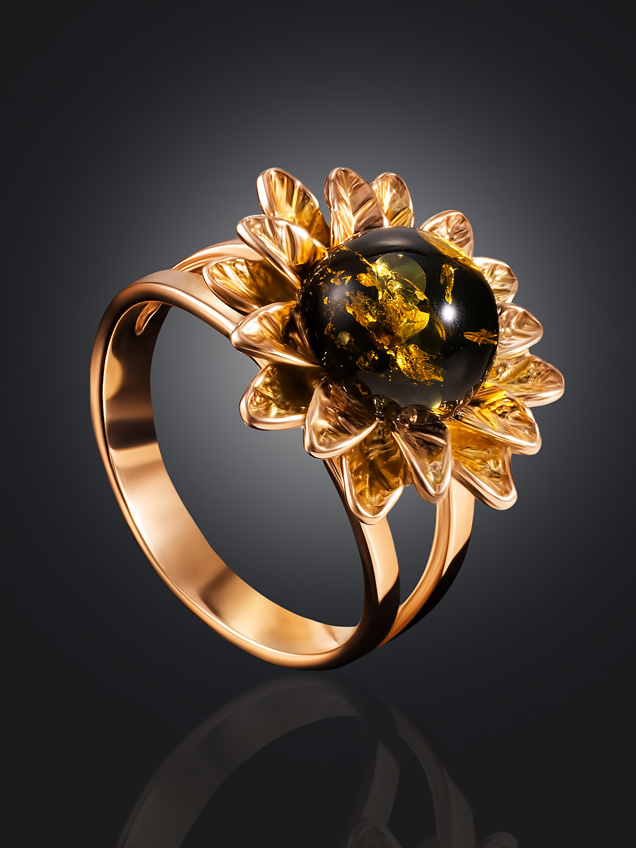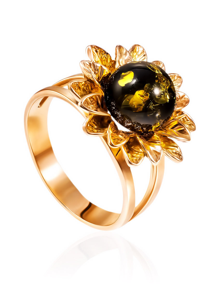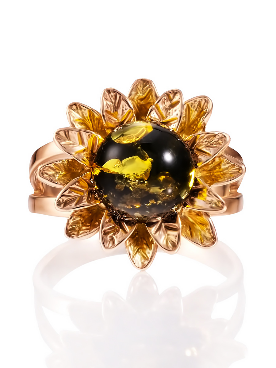 Яркое стильное кольцо с янтарём зелёного цвета «Астра»