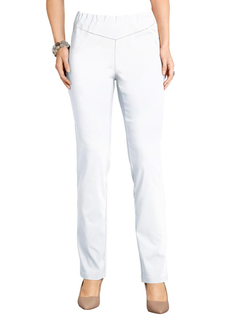 Просто и элегантно: брюки с V-образным вшитым поясом спереди со скрывающим недостатки фигуры эффектом. Потайной пояс на резинке по кругу и вставки из стретча обеспечивают отличную посадку.