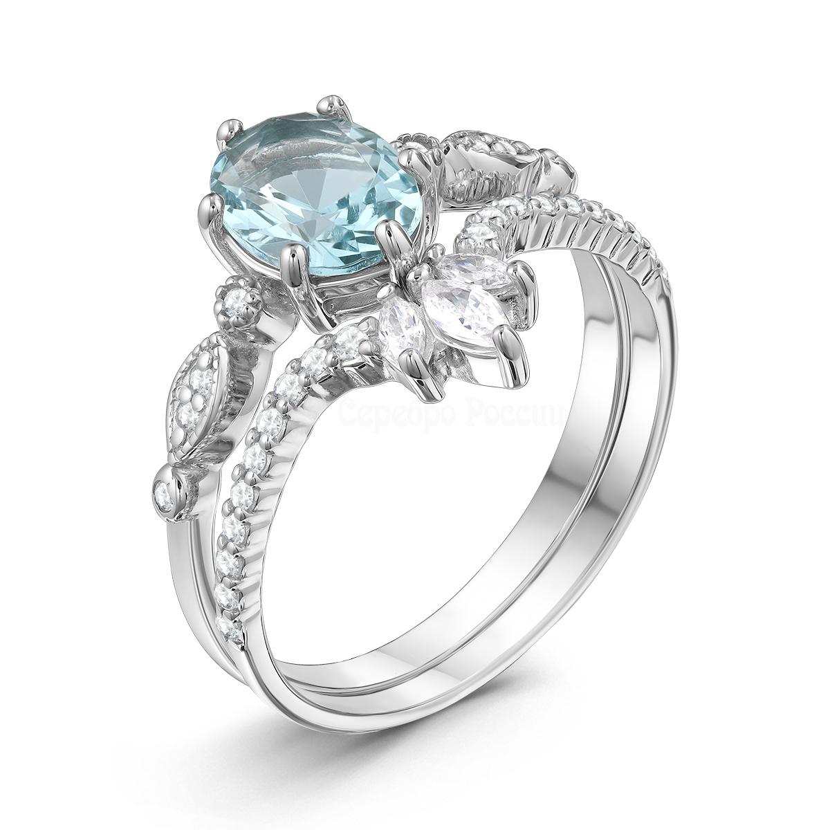 Кольцо двойное из серебра с пл. кварцем цв. Sky топаз и фианитами родированное 925 пробы К-3922рс10200