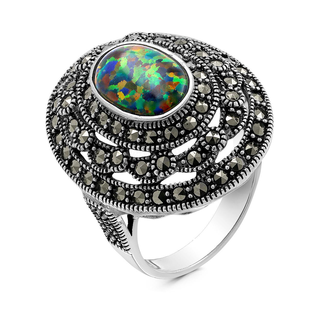 Кольцо из чернёного серебра с синт.опалом и марказитами 925 пробы HR-104оп