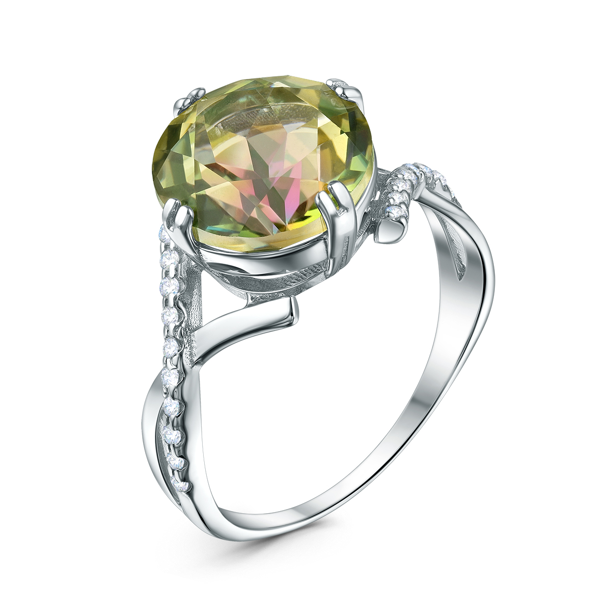 Кольцо из серебра с жёлто-зелёным горным хрусталём и фианитами родированное 211269-FA11GH5