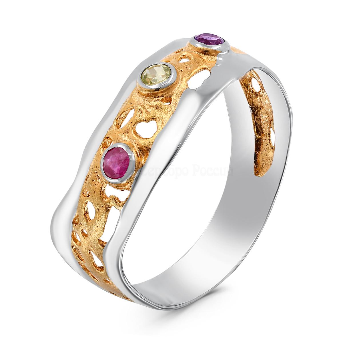 Кольцо из золочёного серебра с корундом, нат.аметистом, нат.хризолитом и родированием 925 пробы R161