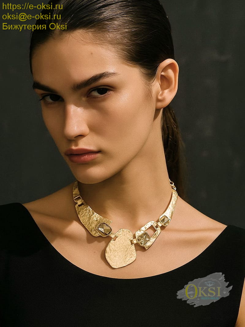 Стильное колье с оригинальной техникой исполнения ''мятый металл'' - модный тренд этого сезона ! Качественное гальваническое, матированное покрытие золотого цвета, крупные сверкающие кристаллы. Длина колье 45 см + 7 см удлиняющая цепочка.