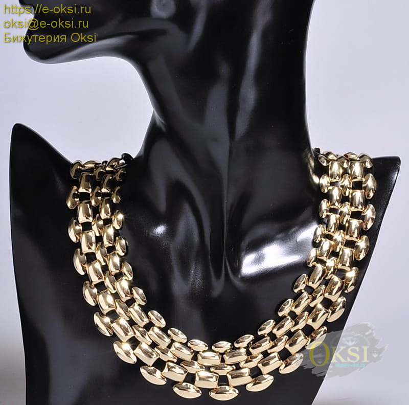 Хит сезона! Эффектное колье - украшение в итальянском стиле : на каждый день, на торжество, на вечеринку . Комфортно и удобно ложится по основанию шеи. Длина ( размер) колье 43 см., ширина 3 см. Качественное гальваническое покрытие золотого цвета.