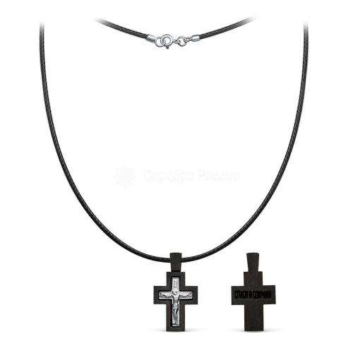 Колье с крестом из дерева граб на текстильном вощёном шнурке с элементом из родированного серебра - Распятие, 2 см ГК-014