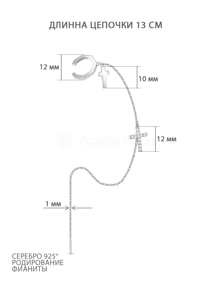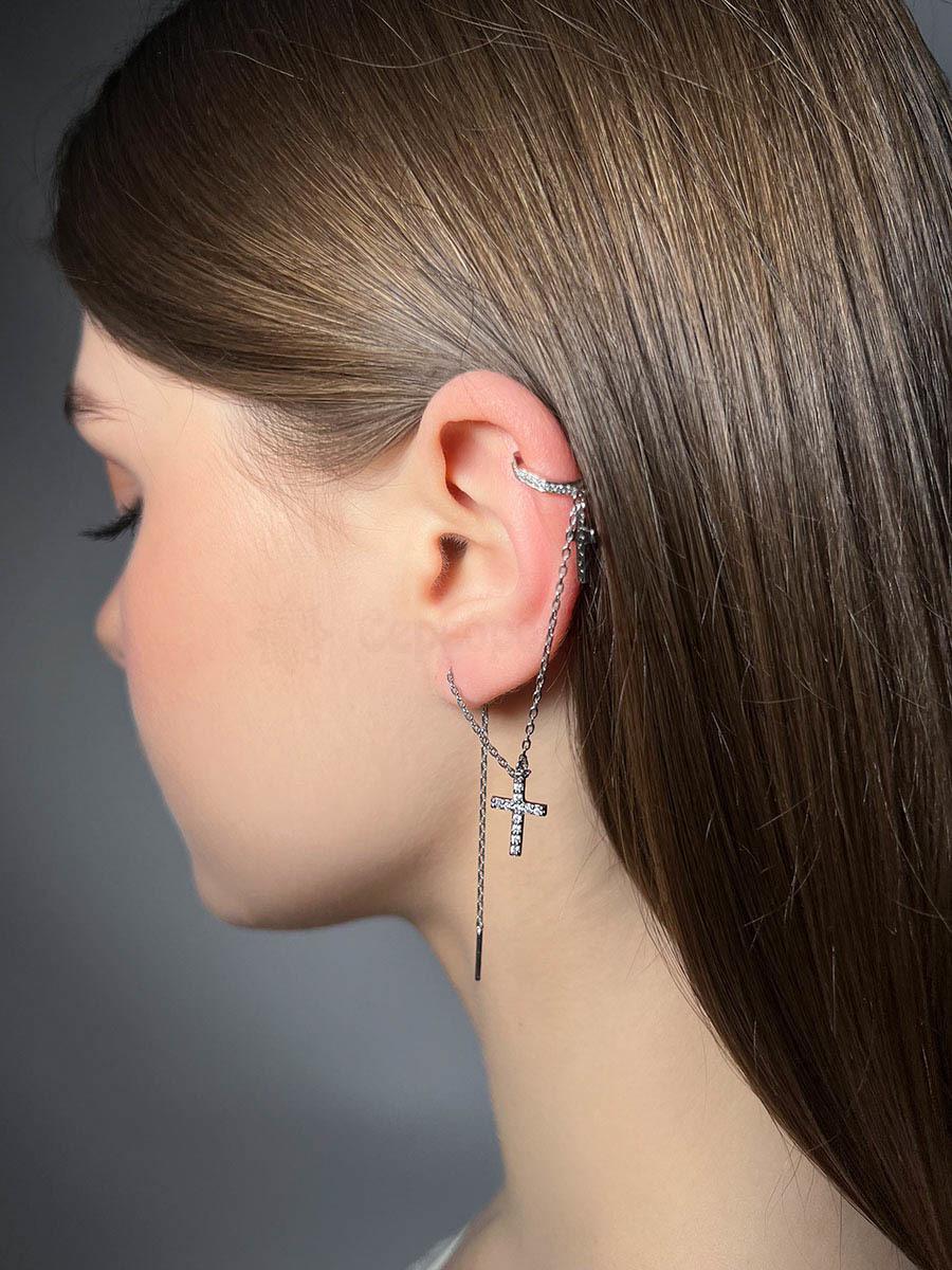 Моносерьга продёвка с каффой и крестами женская из серебра с фианитами родированная 925 пробы 28045р
