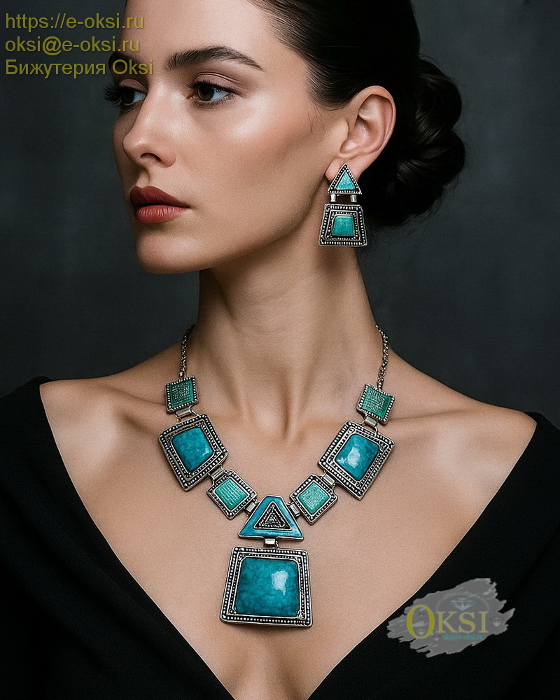 Стильный комплект в бирюзовых оттенках. Удачно подобраны и идеально сочетаются оттенки бирюзового цвета: от нежно -лазурного до насыщено - ультрамаринового. Во многих культурах бирюзовый цвет занимает совершенно особое положение. Бирюза считается защитным талисманом. Хорошо ''освежает'' кожу лица и не зависит от сезона и моды. Длина колье 50 см .