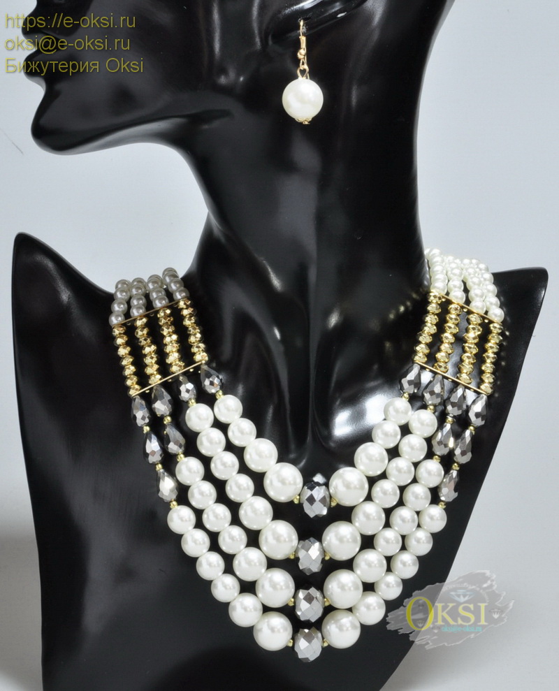 Массивный,но очень лёгкий комплект из искусственного жемчуга и хрустальных бусин. Отлично подойдет для торжества или к свадебному платью, сочетается с любым цветом.Длина колье 45 см + 5 см цепочка.