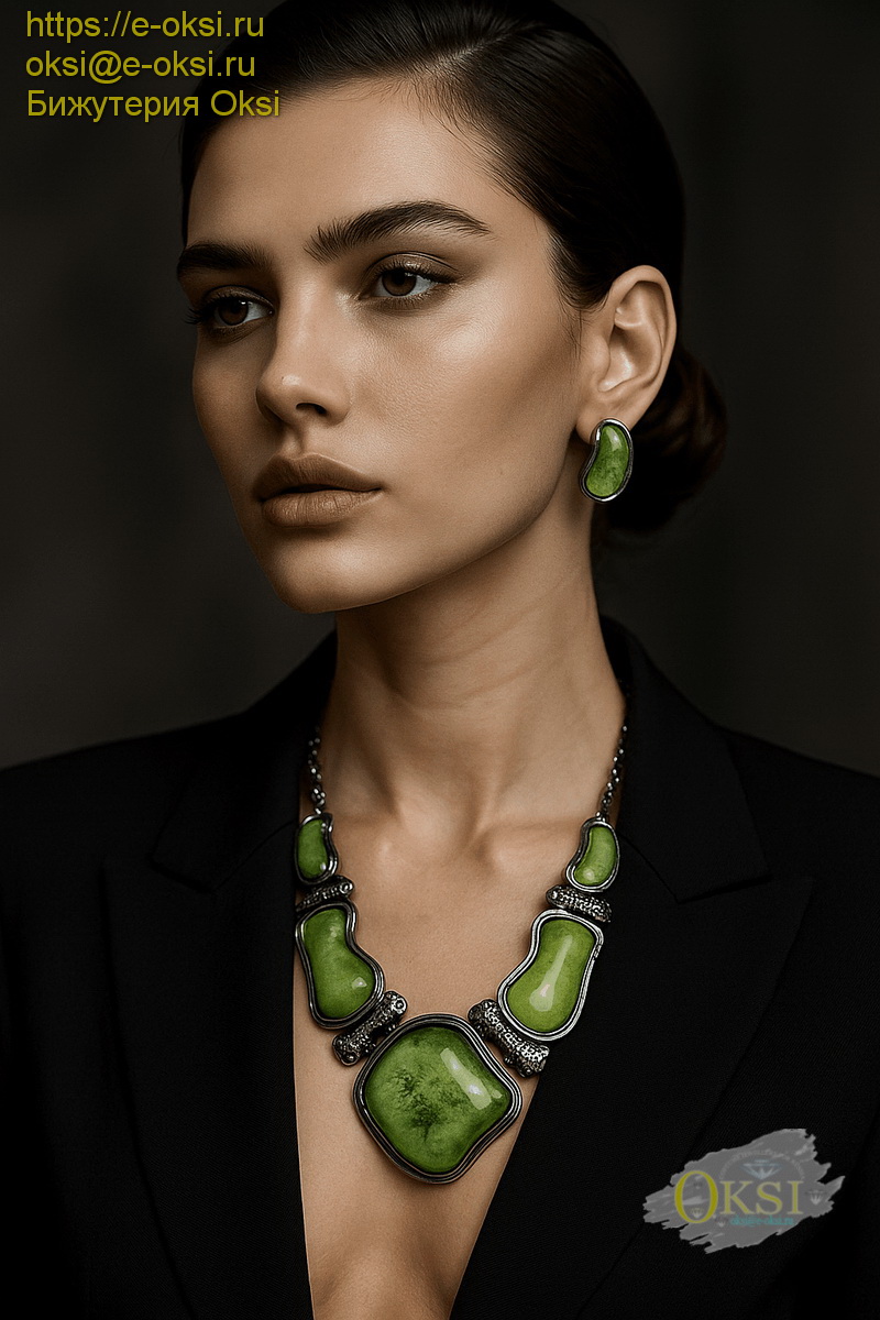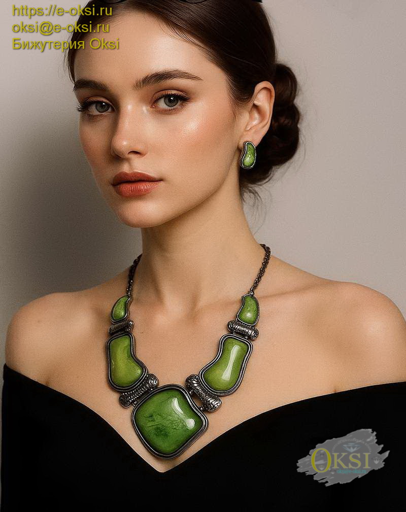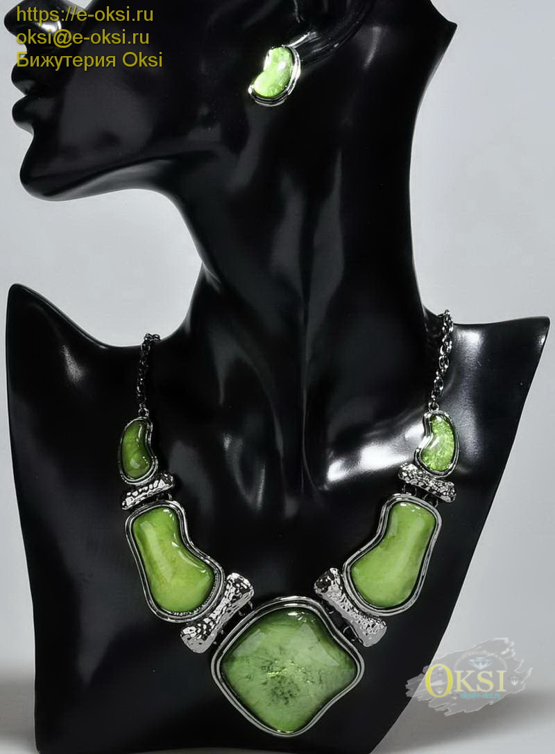 Роскошный комплект украшен ювелирной эмалью мерцающего оливково - зеленого оттенка. Качественное родиевое покрытие серебряного цвета. Длина колье 45 см.